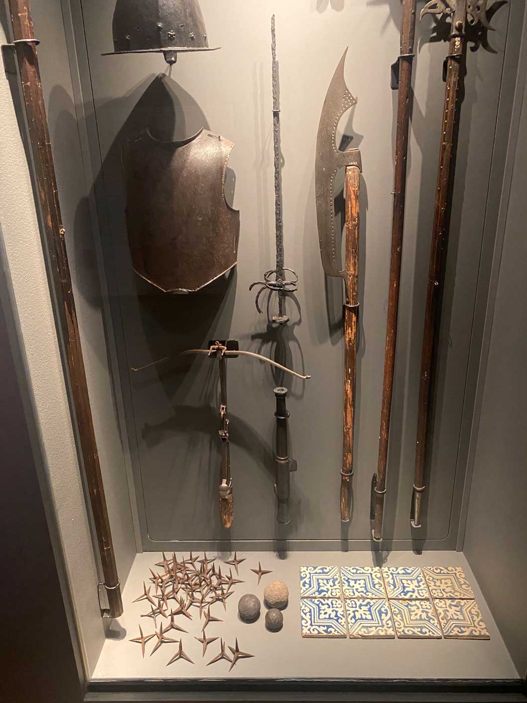 Allerlei wapens zijn in de onderstaande vitrine te zien. Het gaat dan om allerlei soorten steekwapens, maar ook kraaienpoten die op de grond gegooid werden zodat de paarden van de vijand erdoor gewond raakten. Op de grond liggen ook nog een aantal kanonskogels en tegels van het Alvsborg kasteel.