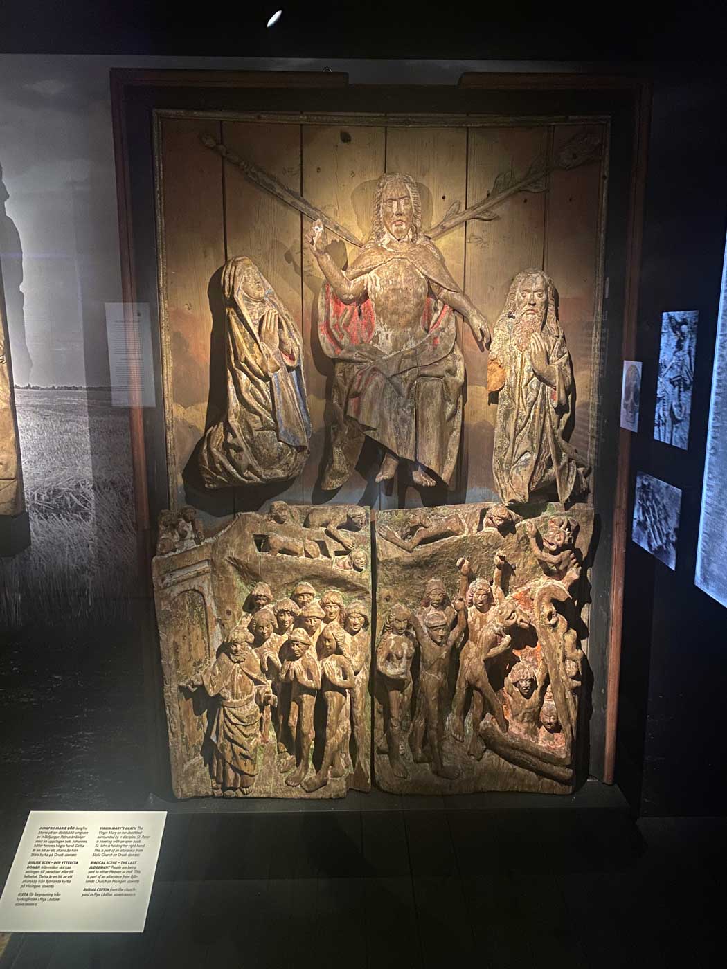 De volgende foto laat een tweetal Bijbelse afbeeldingen zien. Boven in de foto het laatste oordeel. Onder wordt de dood van de maagd Maria afgebeeld waarbij ze omringt is door de 11 apostelen.