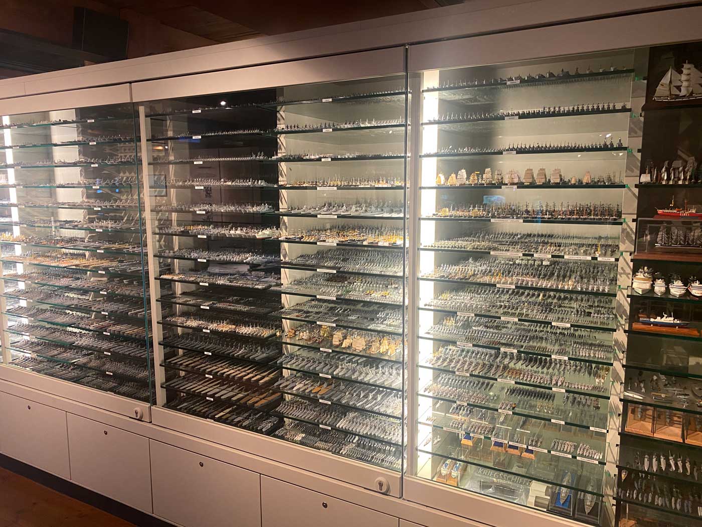 De grootste hoeveelheid scheepsmodellen bevindt zich echter op de negende en laatste verdieping van het museum. In het begin van de jaren ’30 van de vorige eeuw begon Friedrich Karl Peltzer met het maken van schaalmodellen van allerlei schepen op een schaal van 1:1250. Toen een Berlijns bedrijf startte met het maken van een modelhaven met pakhuizen, kranen en vuurtorens ging de verkoop steeds beter lopen.