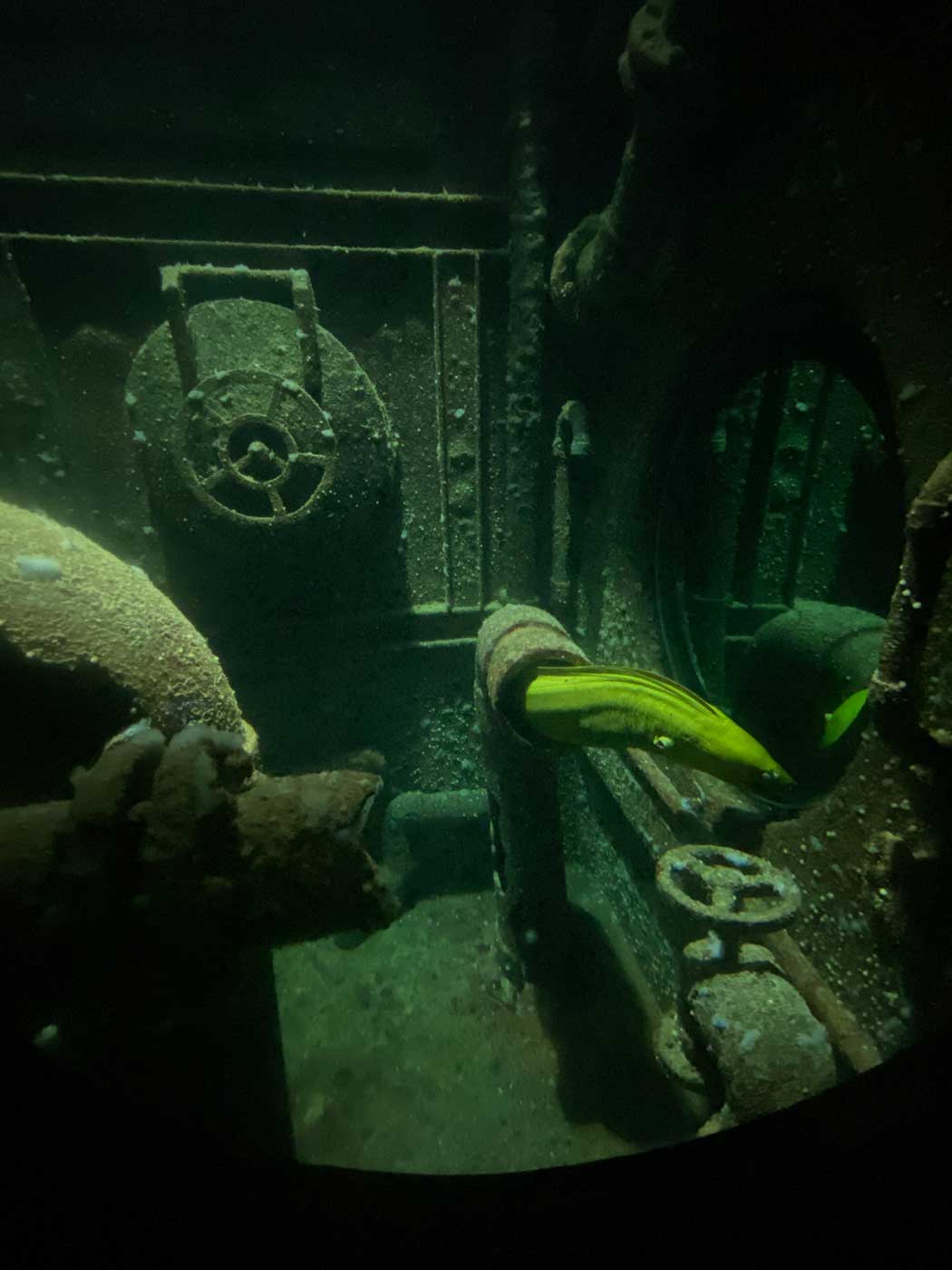 Op de volgende foto is een groene murene te zien. Dit dier leeft in tropische en subtropische koraalriffen tot dieptes van 200 meter.