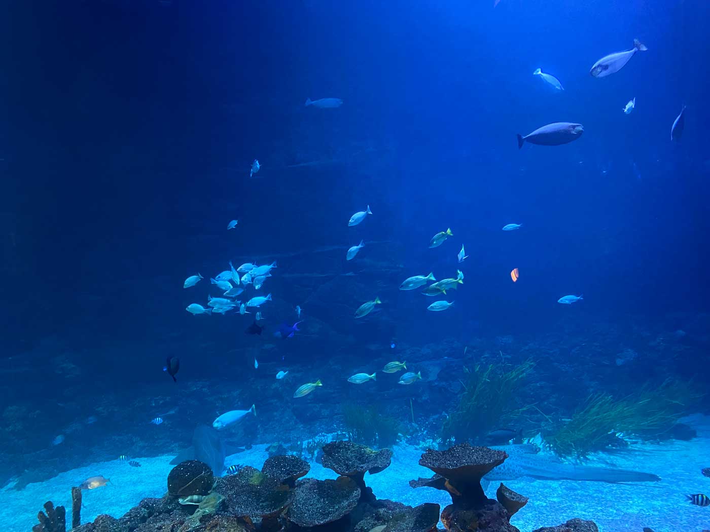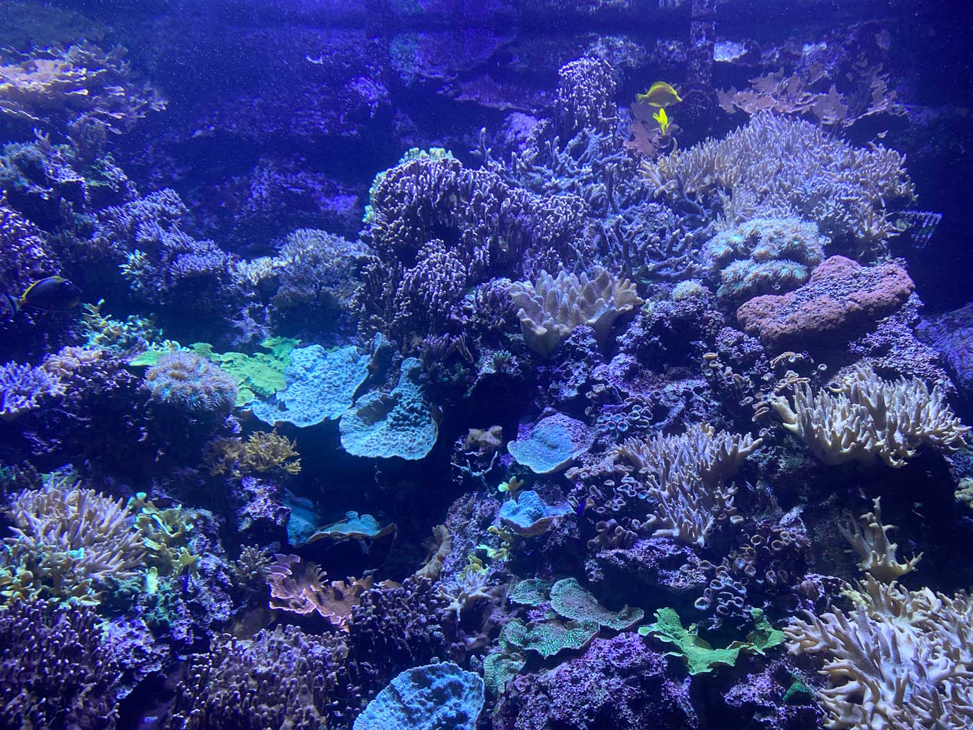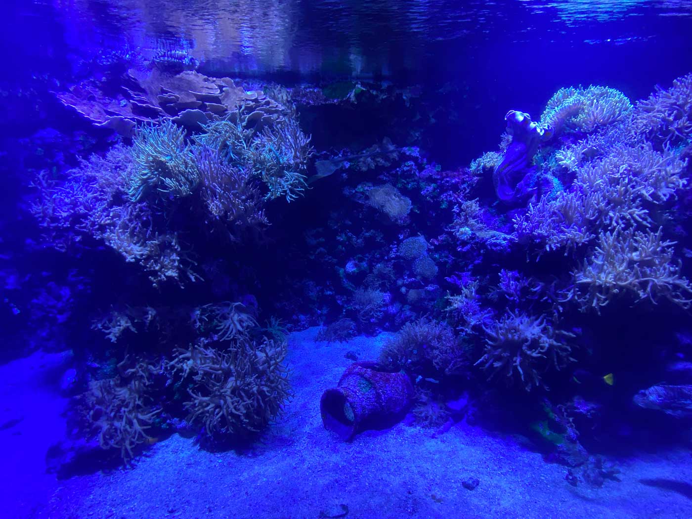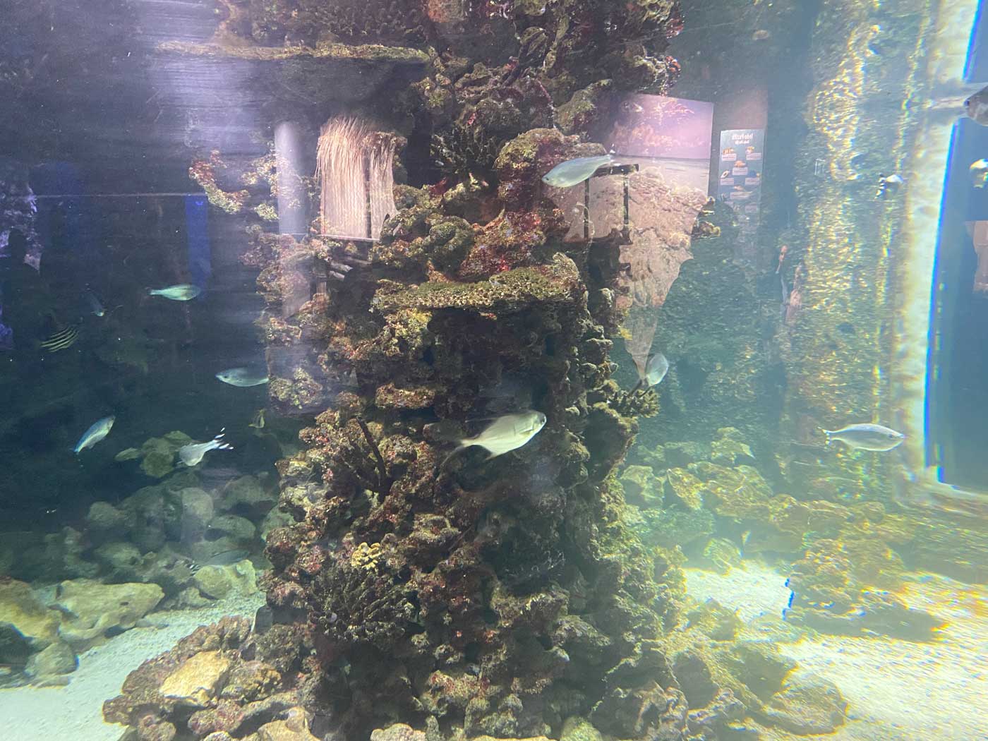 Een ander onderdeel van het aquarium is een ruimte vol met koraal. In veel delen van de wereld loopt het koraal gevaar. Wanneer de temperatuur van het water meer dan 31 graden is, wordt het koraal wit en gaat afsterven. Er blijft dan een dood kalkskelet over. Zoals op de volgende foto’s te zien is, bestaat het aquarium uit een flink aantal delen. Van kleine tot zeer grote stukken. Erg indrukwekkend en mooi om te zien.