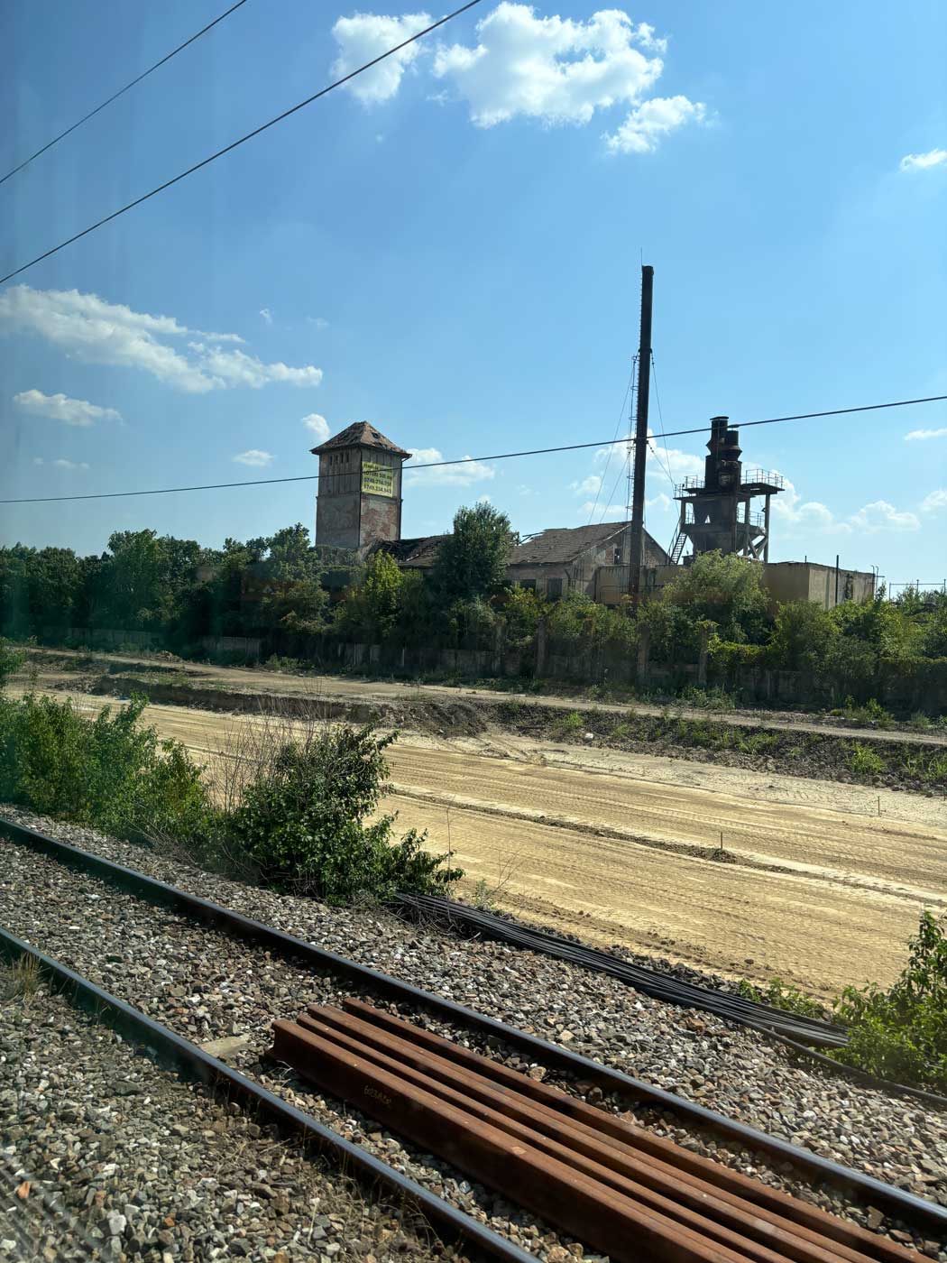 Op de volgende foto is weer een vervallen fabrieksgebouw te zien dat langs het spoor staat. Een van de redenen dat de trein af en toe stil stond zal ongetwijfeld zijn dat in Roemenië bepaalde spoorlijnen enkelsporig zijn. Hierdoor moet een trein soms dus wachten totdat het spoor vrij is en een trein uit de andere richting gepasseerd is.