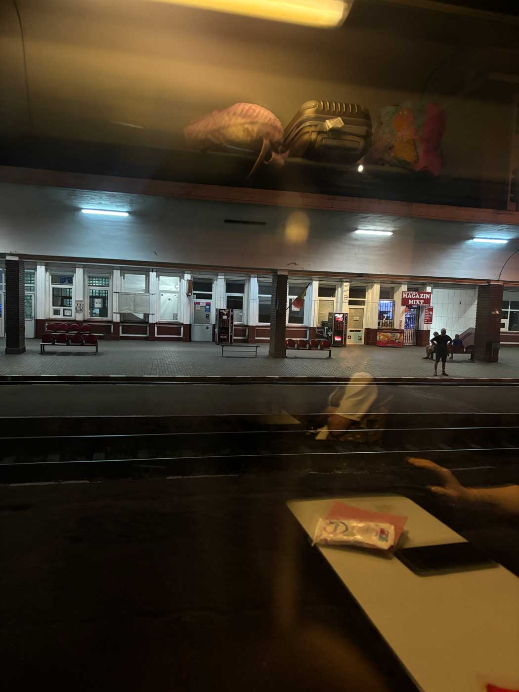 De aankomst op het station Filiasi was rond 20.45 uur. De vertraging was van 20 minuten teruggelopen tot een kleine 10 minuten. Inmiddels begon het langzaamaan donker te worden dus het nemen van foto’s van de omgeving was van nu af aan niet echt meer mogelijk. De temperatuur in de trein zelf werd ook steeds aangenamer.