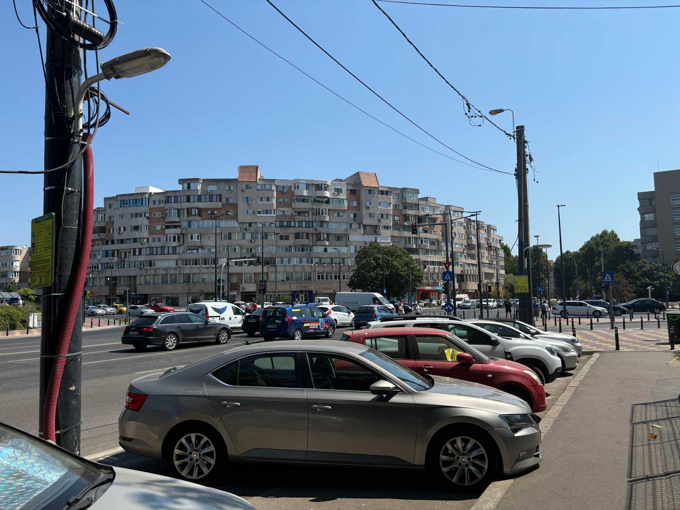 Bij een van de grotere kruispunten van de stad staat een enorm cirkelvormig appartementencomplex wat geheel van beton lijkt te zijn gemaakt.