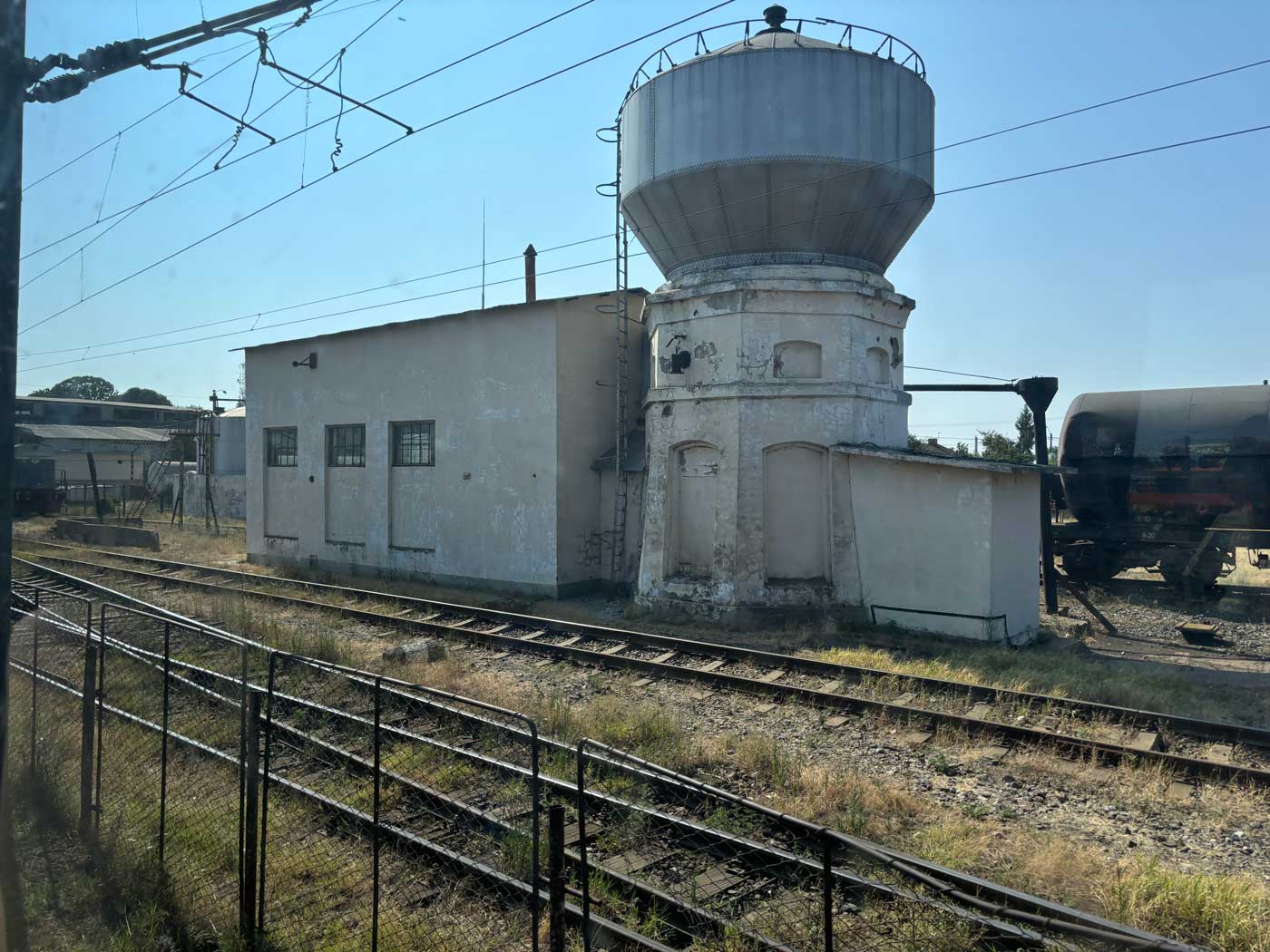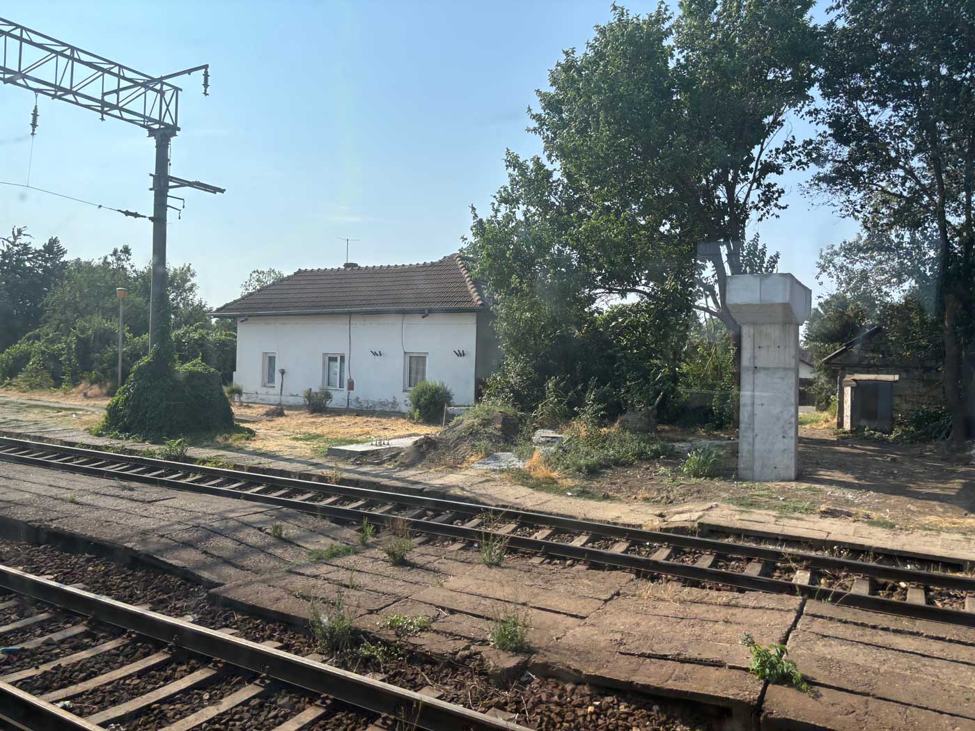 De typische bouwwerken van beton die je veel in Oost-Europese landen zien, staan overal langs het spoor. Ook hier ziet het er qua onderhoud niet erg goed uit. Het is niet duidelijk of de gebouwen nog in gebruik zijn of leegstaan en daardoor steeds verder verwaarlozen.