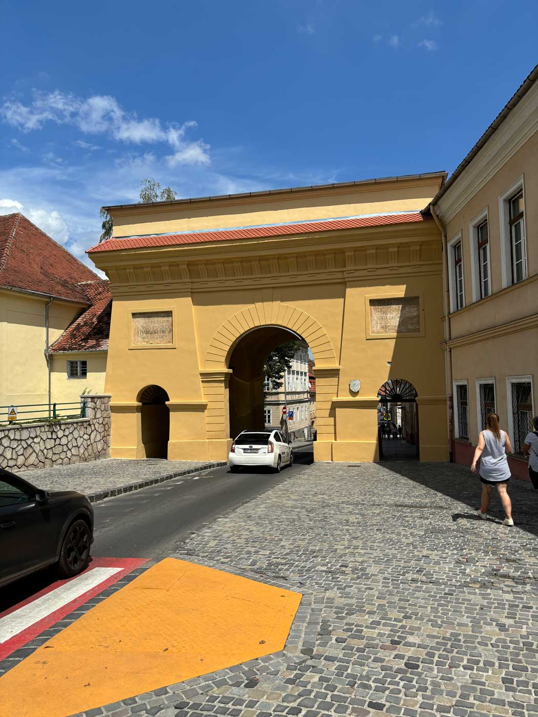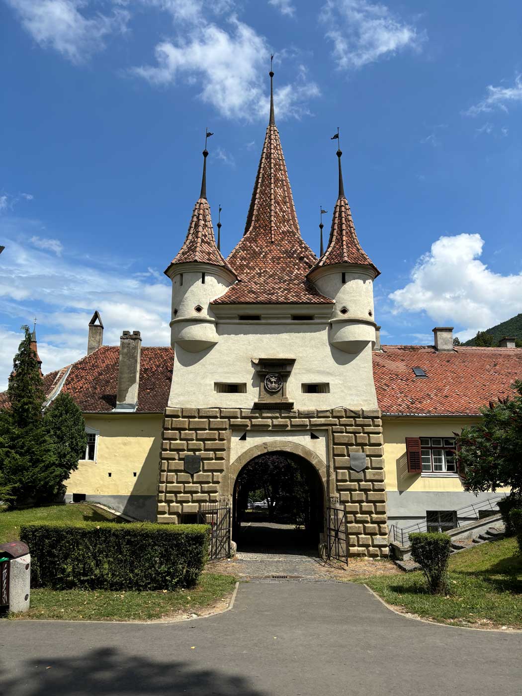 Vanuit het museum ben ik verder de oude stad van Brasov ingelopen. De Schei poort is een van de toegangspoorten tot dit gedeelte. Deze poort is rond 1827 gebouwd zodat ook hogere voertuigen de stad binnen konden komen. Rond dezelfde tijd werd de veel grotere Catharina poort afgebroken. Naast een grote doorgang in het midden zijn er links en rechts ook nog twee kleinere doorgangen voor voetganers.
