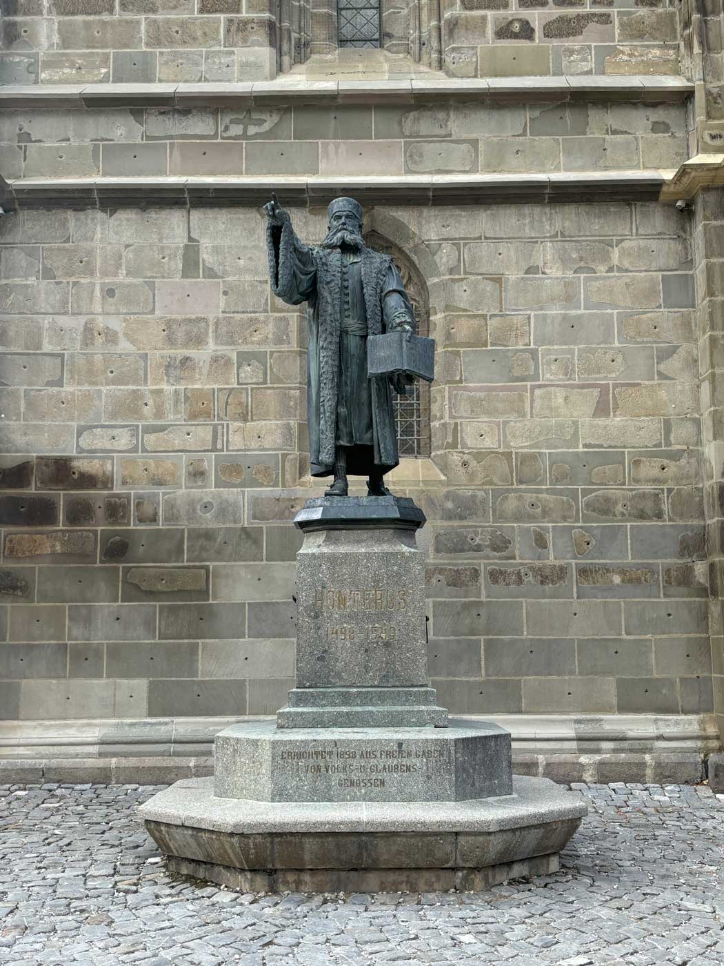 Na een korte wandeling ben ik uitgekomen bij de Zwarte Kerk van Brasov. Naast deze kerk staat een beeld van Johannes Honterus. Dit was een humanist en kerkelijk hervormer uit de eerste helft van de 16de eeuw. Hij werd opgeleid door de Dominicanen in Wenen. Moest in 1529 bij de belegering van Wenen door de Turken vluchten naar Duitsland en kwam in 1544 weer terug naar Brasov. Hier werd hij pastoor, oprichter van papiermolen en stichter van de bibliotheek.