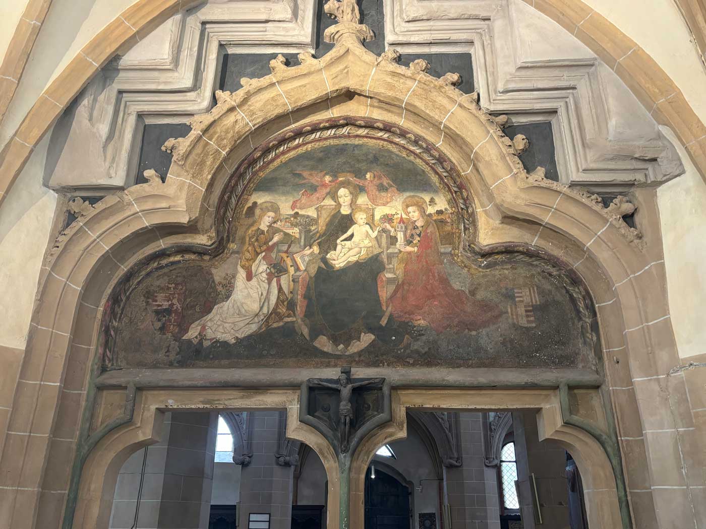 In de Middeleeuwen was zeer waarschijnlijk de hele kerk van de binnen- en buitenkant beschilderd. Deze schilderingen zijn bijna volledig verdwenen. Naast enkele schilderingen die bij restauraties weer zichtbaar zijn geworden, is er een schildering die altijd behouden blijft. Hierop wordt de maagd Maria afgebeeld met het kindje Jezus en twee heiligen. Op de schildering zijn de wapens te zien van de Hongaarse koning Matthias Corvinus en zijn vrouw Beatrijs van Aragon. Dit betekent dat de schildering na 1476, het jaar waarin beiden trouwden, gemaakt moet zijn.