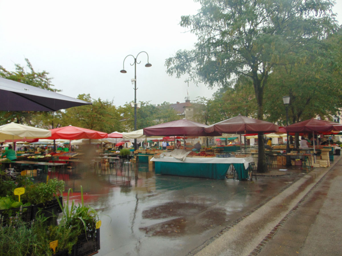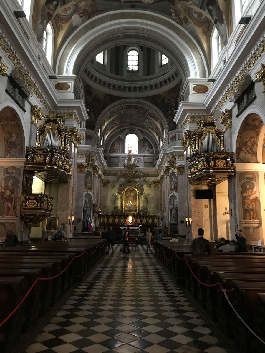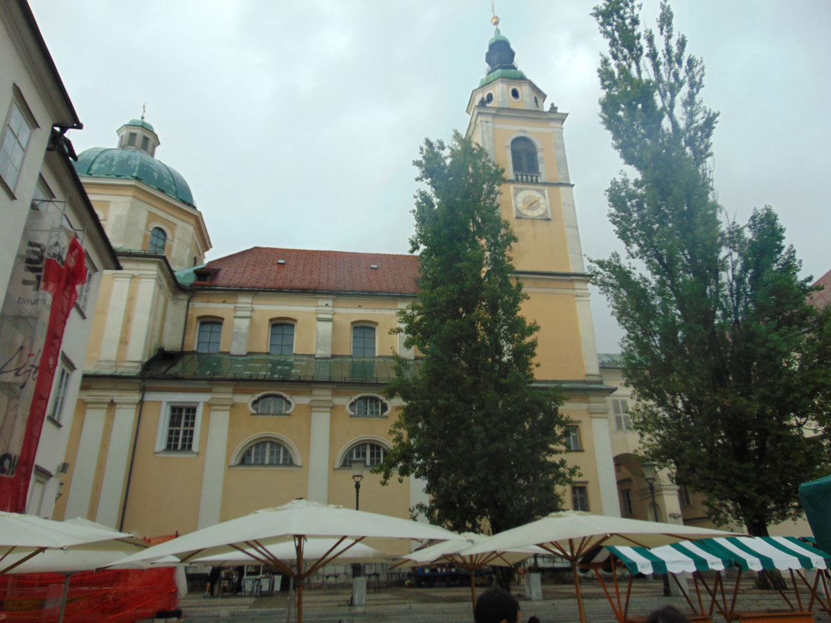 Inmiddels was ik aangekomen bij de Sint-Nicolaaskathedraal en dat was een mooie gelegenheid om even te schuilen voor de regen. Dit is de belangrijkste kerk van het aartsbisdom Ljubljana. De kerk wordt voor het eerst genoemd in het jaar 1262. In de loop der eeuwen is de kerk een aantal keer opnieuw opgebouwd vanwege brand.