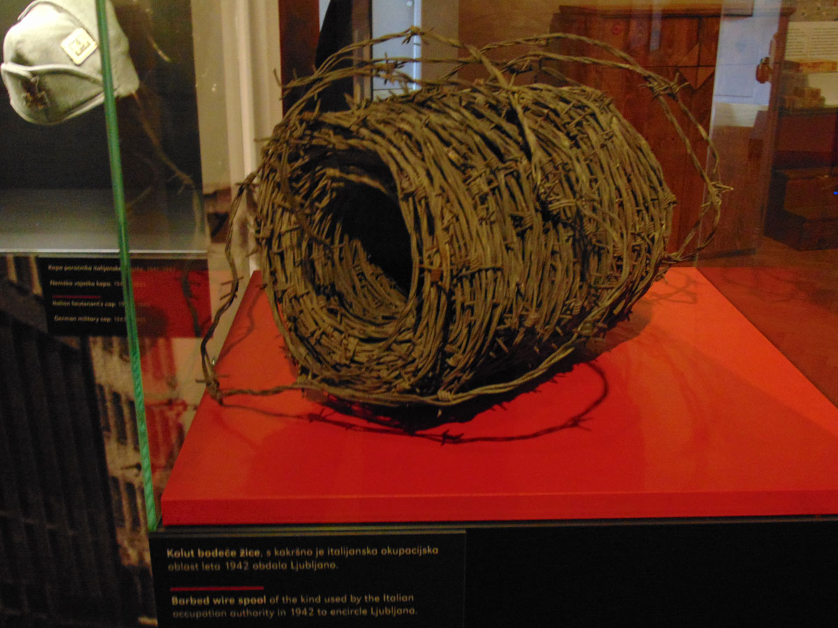 Na even een stap in de tijd gemaakt te hebben, is op de onderstaande foto het prikkeldraad te zien waarmee het Italiaanse leger in 1942 de stad heeft afgesloten. Ljubljana werd in 1941 door de Italianen bezet In 1943 werd de stad veroverd door Duitse troepen en werd de bezetting nog grimmiger.