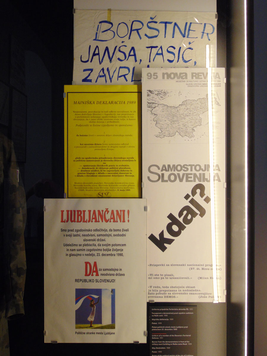 Op de volgende foto zijn een aantal posters te zien die te maken hebben met de Sloveense onafhankelijkheid. Het gele papier is de meiverklaring uit 1989. Hierin werd toen opgeroepen tot een onafhankelijk Slovenië. Rechtsonder is een poster te zien uit december 1990 waarin de kiezers wordt opgeroepen om ja te stemmen bij een referendum over de onafhankelijkheid van het land. Slovenië verklaarde zich op 26 juni 1991 onafhankelijk waarna er een 10-daagse oorlog volgde met Joegoslavië. Na afloop hiervan vertrokken de troepen van het Joegoslavische leger uit het land.