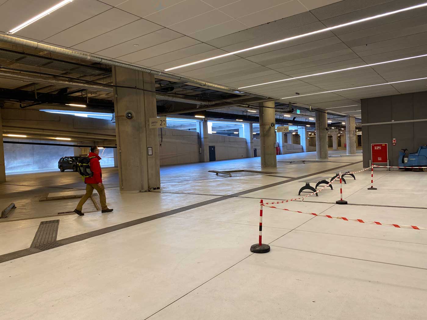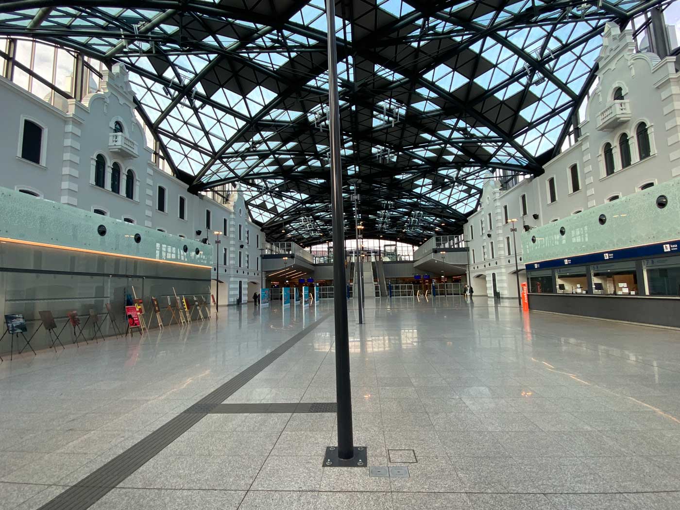 De treinen komen aan in het onderste gedeelte van het station. Daarna kun je via de roltrap naar het zeer grote en moderne stationsgebouw toe. En dan valt er meteen iets op en dat is de enorme leegte. Van dit enorme station maakten in 2021 maar gemiddeld 7500 personen per dag gebruik. Er zijn in het hele gebouw ook nauwelijks voorzieningen.