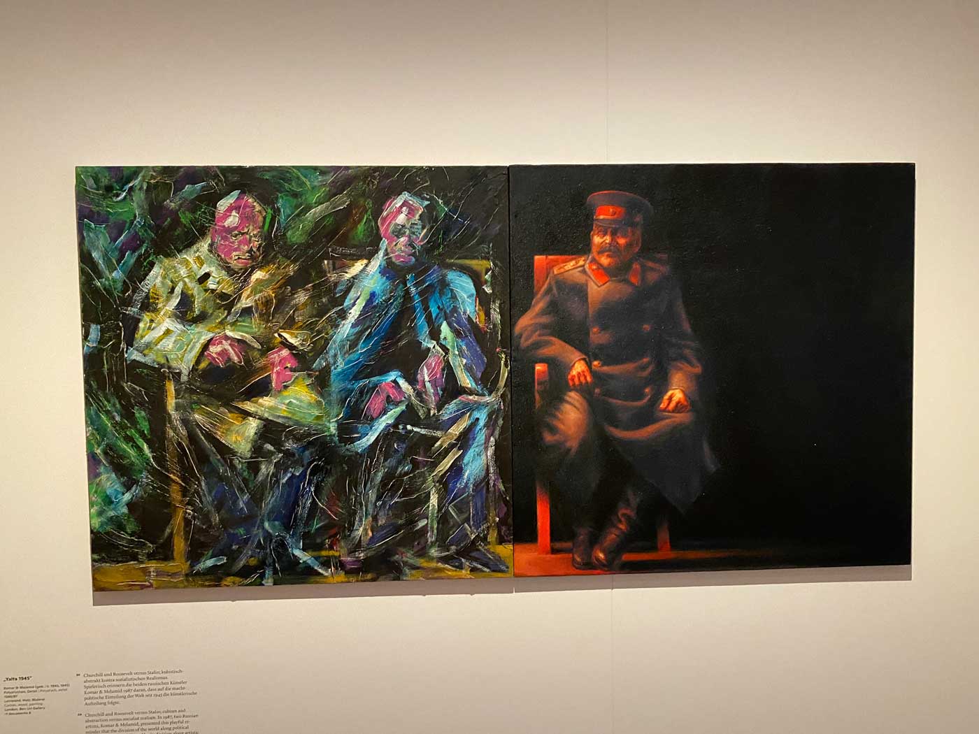 Het verschil tussen oost en west wordt vooral duidelijk op het onderstaande schilderij van de Russische kunstenaars Komar en Melamid uit 1987. Roosevelt en Churchill staan links op het schilderij en zij op een kubistisch-abstracte manier geschilderd. Stalin, rechts op het schilderij, is geschilderd op de manier zoals dat bij socialistische kunst gebruikelijk is.