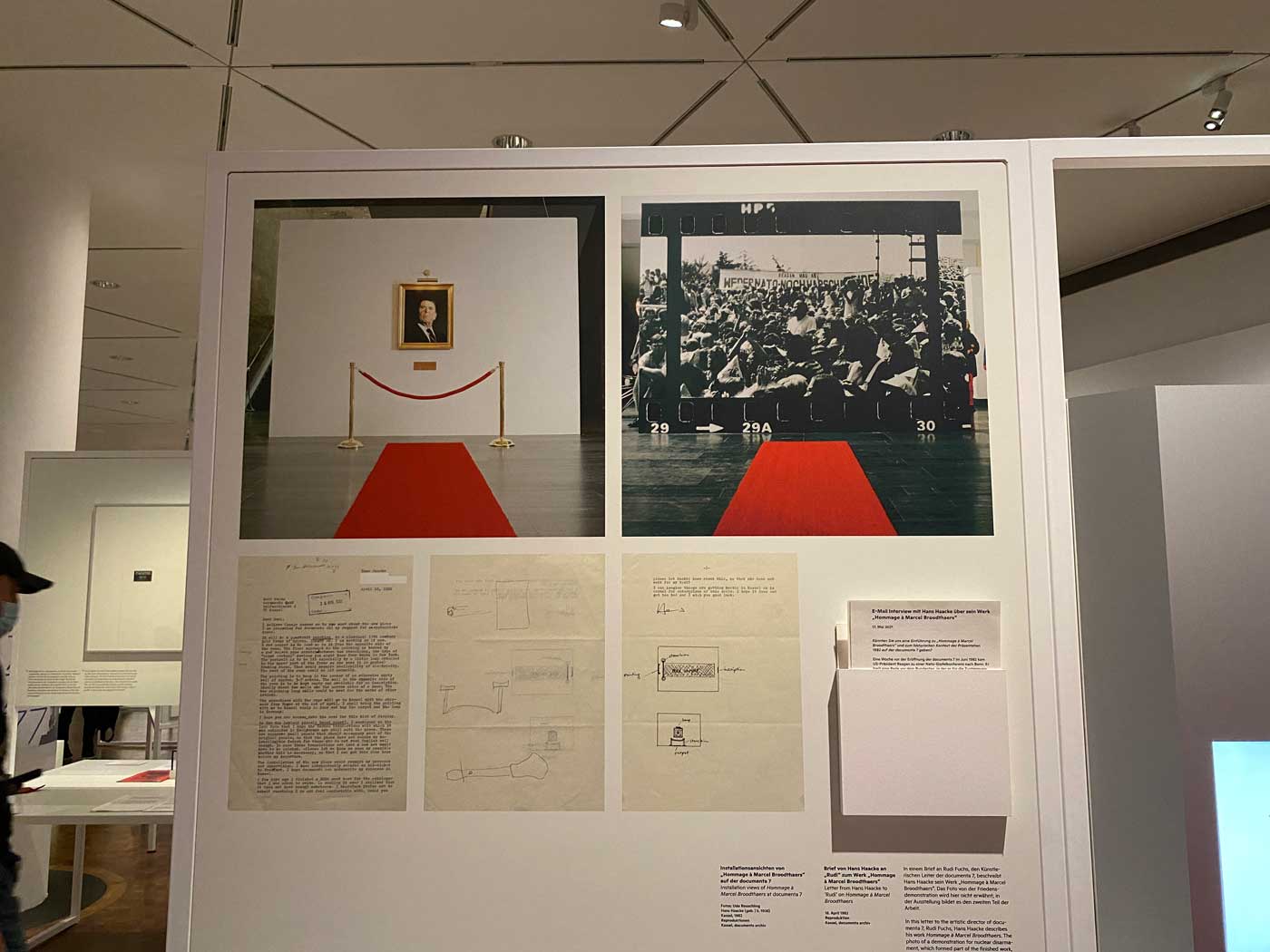 Een ander kunstwerk uit deze tijd is het werk “Hommage a Marcel Broodthaers” van Hans Haacke. Op een muur hangt een schilderij van Ronald Reagan en op de andere muur een foto van een demonstratie tegen de plannen om in Duitsland atoomwapens te plaatsen. Tussen beide objecten ligt op de vloer een rode loper.