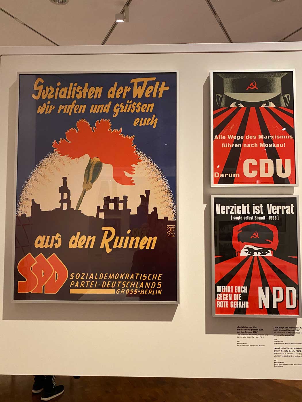 De laatste foto uit dit deel van het reisverslag laat een drietal reproducties van verkiezingsposters zien. Links een poster van de sociaal democratische SPD uit 1947. Rechts een poster van de christen democratische CDU uit 1953 en de neo-nazistische NPD uit 1972. Wat vooral opvalt is de manier waarop de NPD haar poster heeft laten lijken op die van de CDU.
