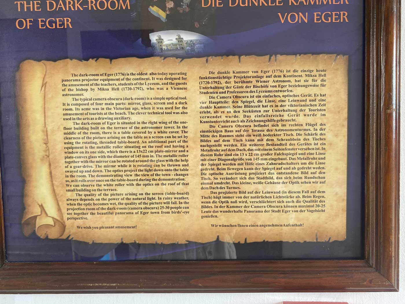 In de toren bevindt zich ook een camera obscura. Dit is een ruimte die uit vier delen bestaat: een lens, een spiegel, een scherm en een donkere ruimte. Hierdoor is het mogelijk om voorwerpen die op grote afstand staan toch scherp te kunnen zien. Een erg handige uitvinding in een tijd dat er nog geen verrekijkers waren. De kwaliteit van het beeld is afhankelijk van de hoeveelheid licht. Aan het eind van de middag was het wat bewolkt geworden waardoor dit tegenviel. Op bepaalde tijdstippen kun je in de ruimte de camera obscura in werking zien. Hiervoor kwam ik toevallig net op tijd. Na de toelichting in het Hongaars was de medewerker zo vriendelijk om alles ook nog in het Engels te vertellen.