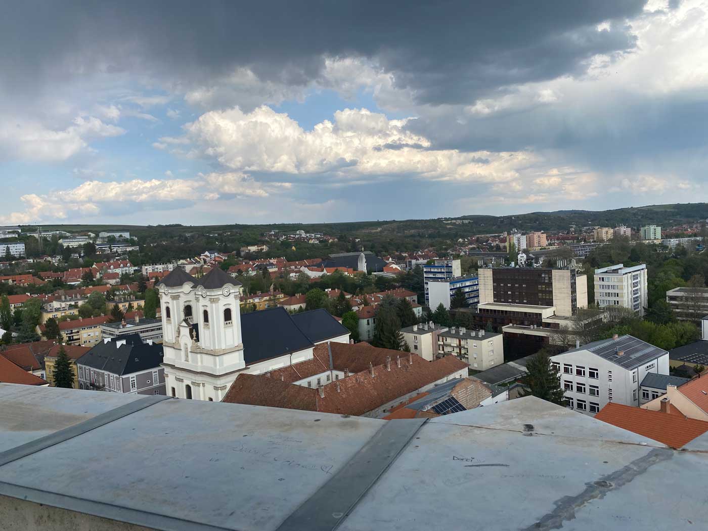 Vanaf de toren heb je verder een mooi overzicht over de stad Eger. Het weer was er inmiddels niet beter op geworden want het was begonnen met regenen.
