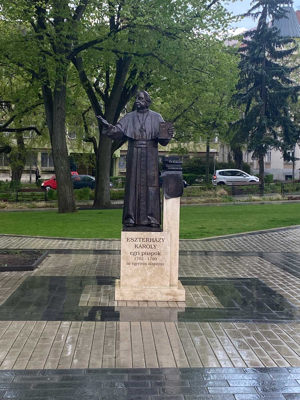 Nadat ik vanuit de toren van het gebouw weer helemaal naar beneden was gelopen, was het alweer half 5 geworden en ben ik rustig richting het station van Eger gelopen. Hier kom je dan nog langs een beeld van Karoly Eszterhazy. Hij heeft geleefd tussen 1725 en 1799 en kwam uit een bekende adelijke familie. In 1748 is hij tot priester gewijd en in 1760 volgde een wijding tot bisschop. Twee jaar later werd hij de bisschop van Eger en bleef dit tot zijn dood.