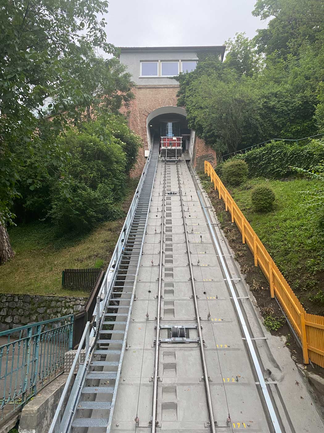 Via een aparte kabelbaan, die in juni 2022 gesloten was vanwege onderhoud, is het mogelijk om relatief snel de berg op te komen of er weer af te gaan zonder een lange wandeling. Vanaf deze plek heb je natuurlijk een mooi overzicht over de stad Graz.