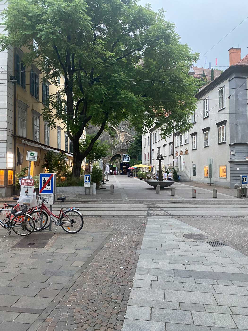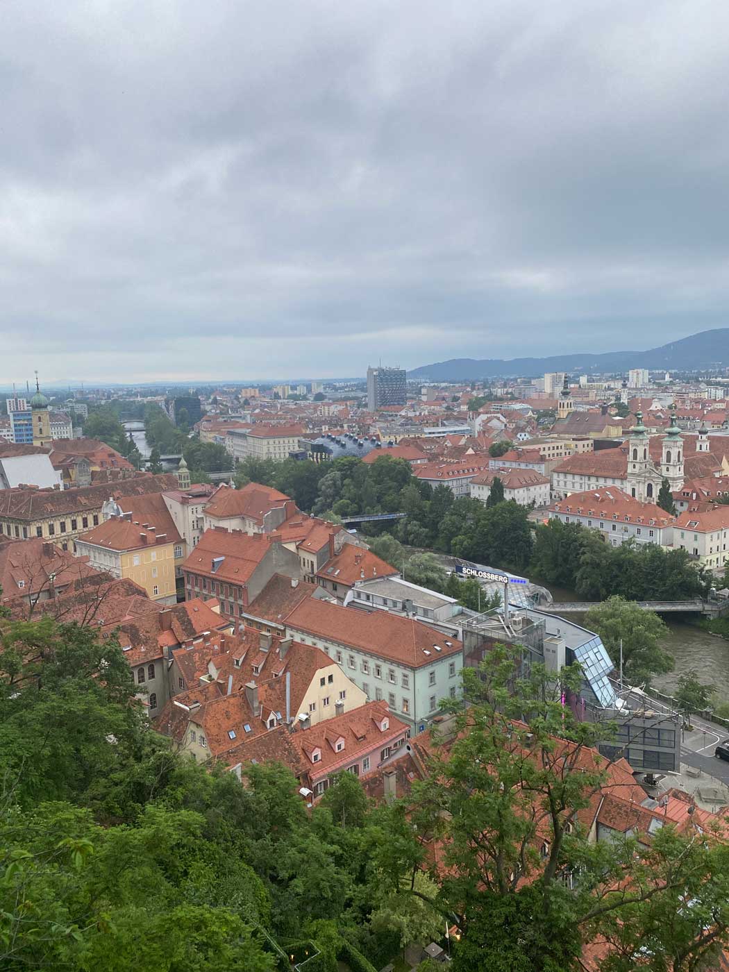 Na wat gegeten te hebben, was er in de avond nog voldoende tijd om een wandeling te maken door het centrum van de stad Graz. Vanaf het centraal station ben ik allereerst richting het centrum gewandeld. Als je dan de rivier de Mur oversteekt, die Graz in twee stukken verdeeld, kom je uit in de buurt van de Schlossberg.