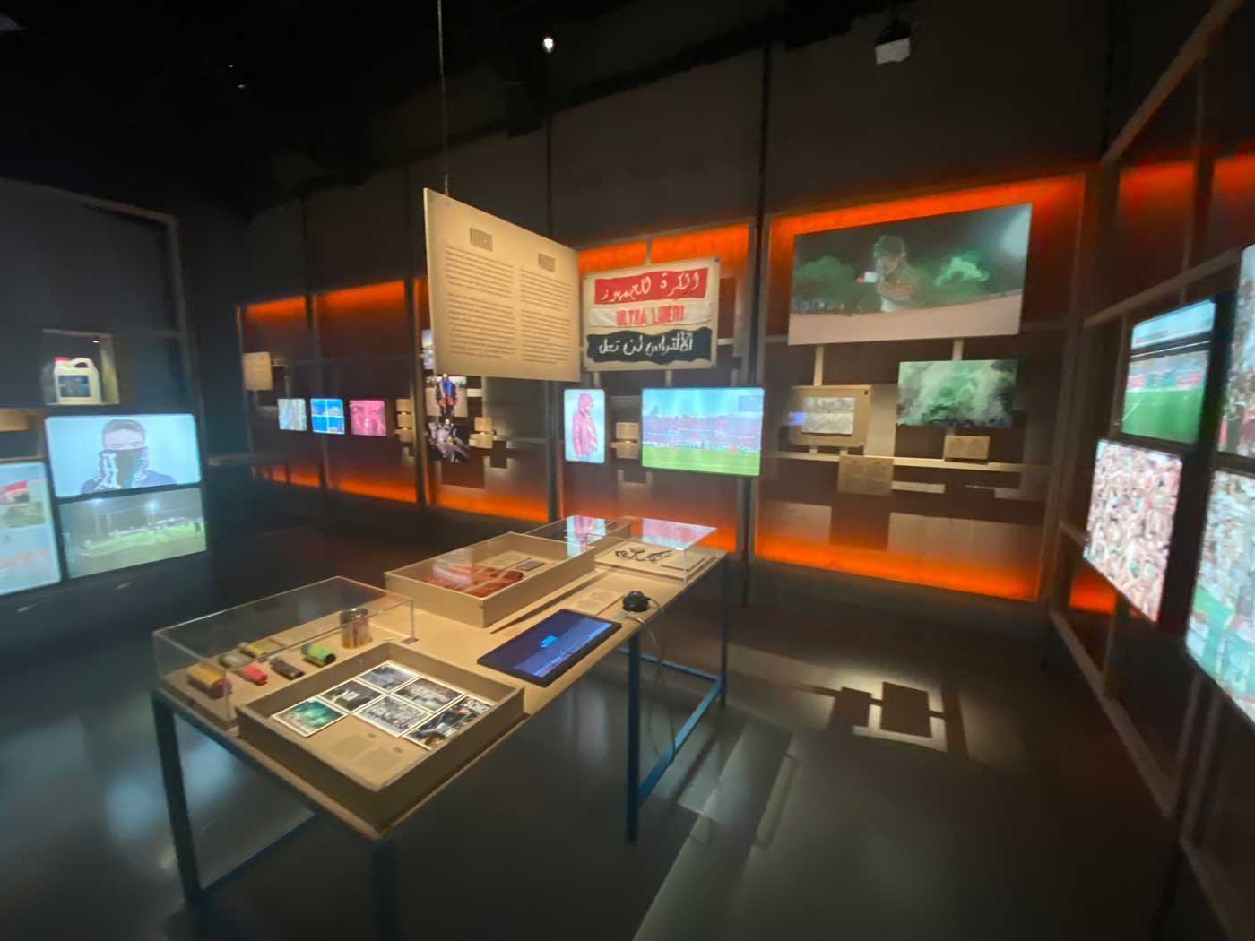 De kern van de collectie van het museum is op de derde en vierde verdieping te zien. Hieronder een foto van de tentoonstelling met als titel “Voetbal en politiek in het gebied rondom de Middellandse Zee”. Tijdens de Arabische lente van 2010 tot en met 2012 waren voetbalsupporters van de kern van deze protesten. De tentoonstelling laat foto’s zien van allerlei soorten voetbalclubs die meegedragen werden tijdens deze protesten.