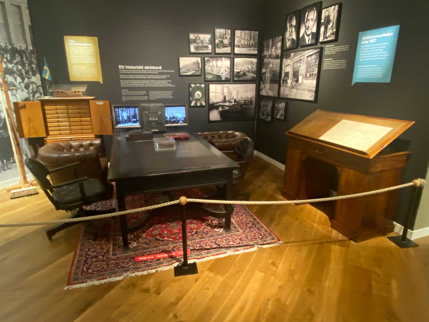 In het eerste gedeelte van het museum staat ook het originele bureau van de oprichters. In de begintijd van het bedrijf werkten alle kantoormedewerkers in dezelfde ruimte. De bezoekers moesten dan plaatsnemen in twee luxueus uitziende maar wel doorgezakte leren fauteuils. Hierdoor zaten ze dus automatisch op een lagere plek dan de twee directeuren. De twee oprichters van Volvo hebben hun hele werkzame leven vanachter dit bureau gewerkt.