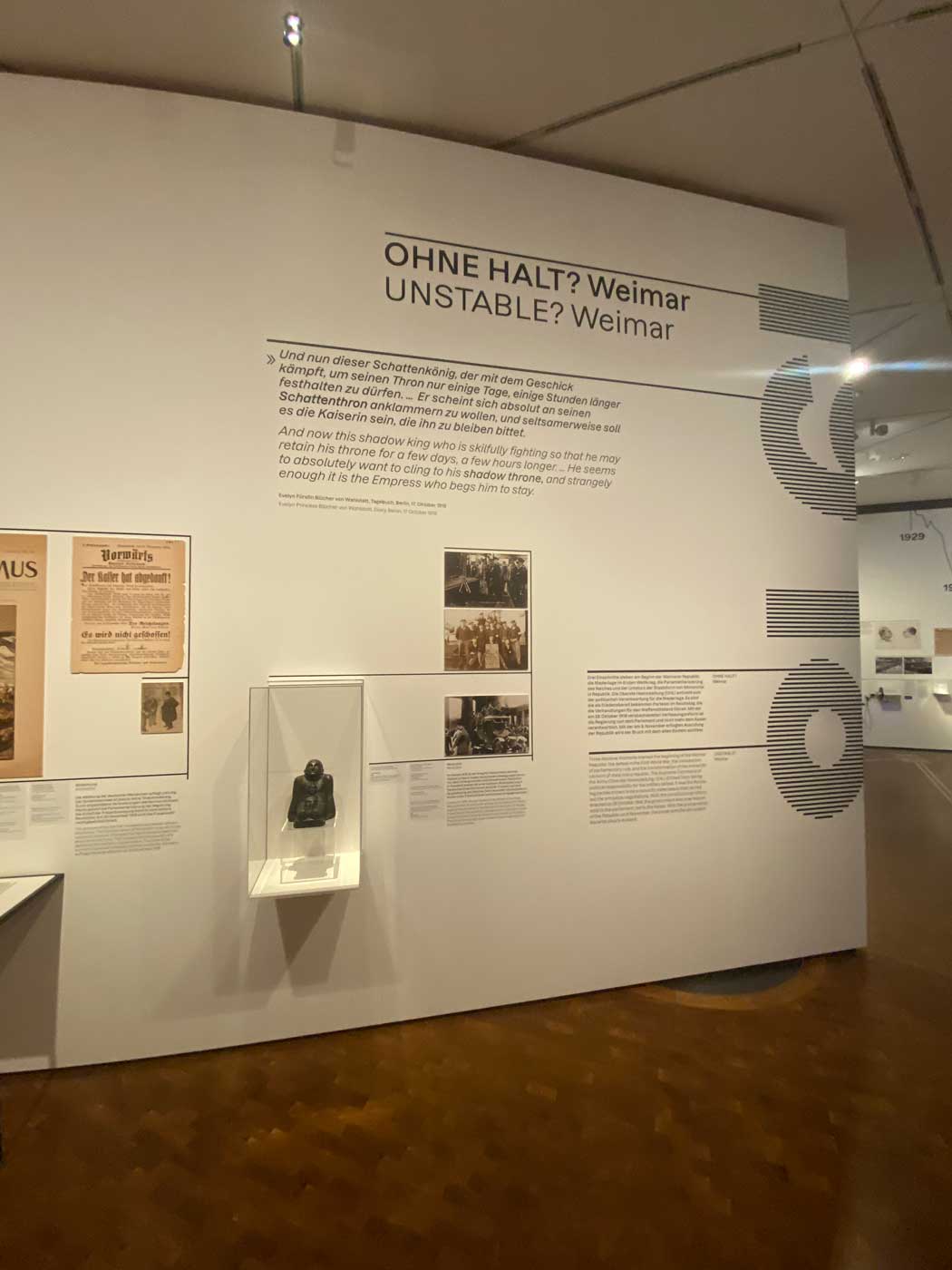 Ook het ontstaan van de republiek van Weimar komt aan bod. Na de nederlaag van Duitsland in de Eerste Wereldoorlog werd het land een parlementaire republiek en verdween de keizer. Het leger onttrok zich aan de verantwoordelijkheid voor de gevoerde oorlog. Door een verandering van de grondwet was vanaf 28 oktober 1918 de regering voortaan verantwoording schuldig aan het parlement en niet meer aan de keizer.