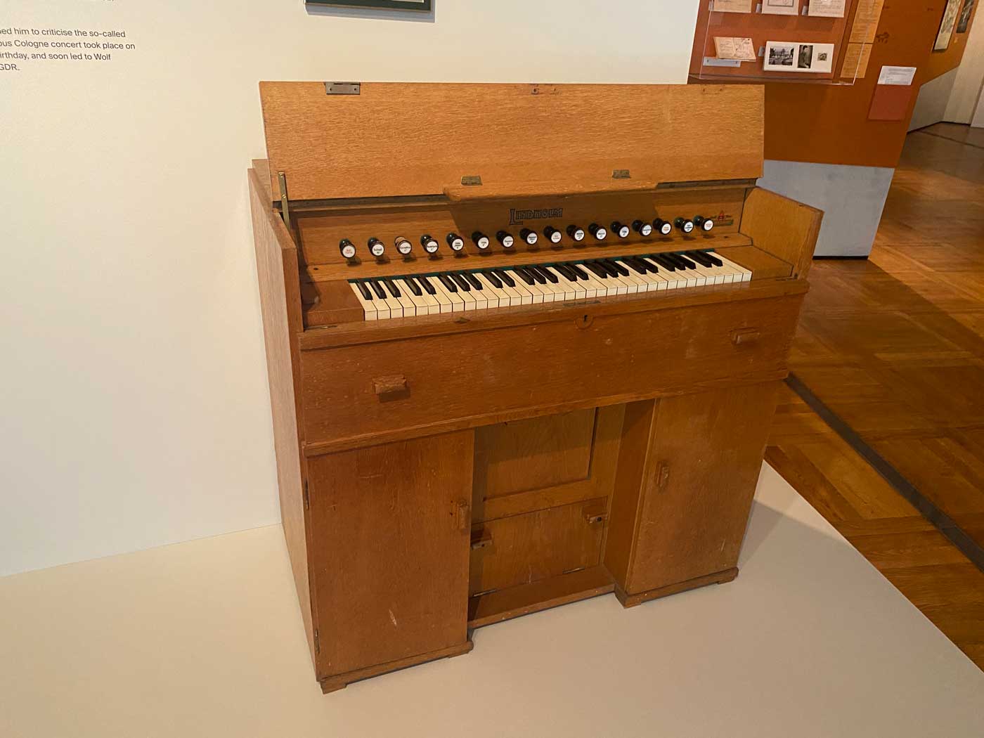 Een van de eerste voorwerpen die je bij deze tijdelijke tentoonstelling ziet is het harmonium dat in 1976 gebruikt is op het concert van Wolf Biermann in Keulen.