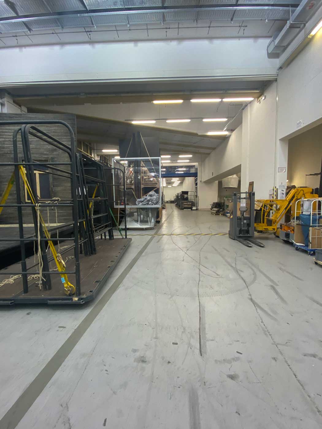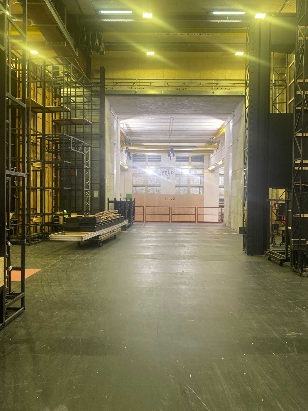 Na een bezoek aan het podium daalden we verder af in het gebouw richting het niveau waar alle materialen het gebouw binnengebracht worden. Hier bevinden zich grote stellages met allerlei opslag maar ook ruimtes waar materialen klaar liggen om weer vervoerd te worden naar het volgende theater waar een bepaalde voorstelling plaats gaat vinden.