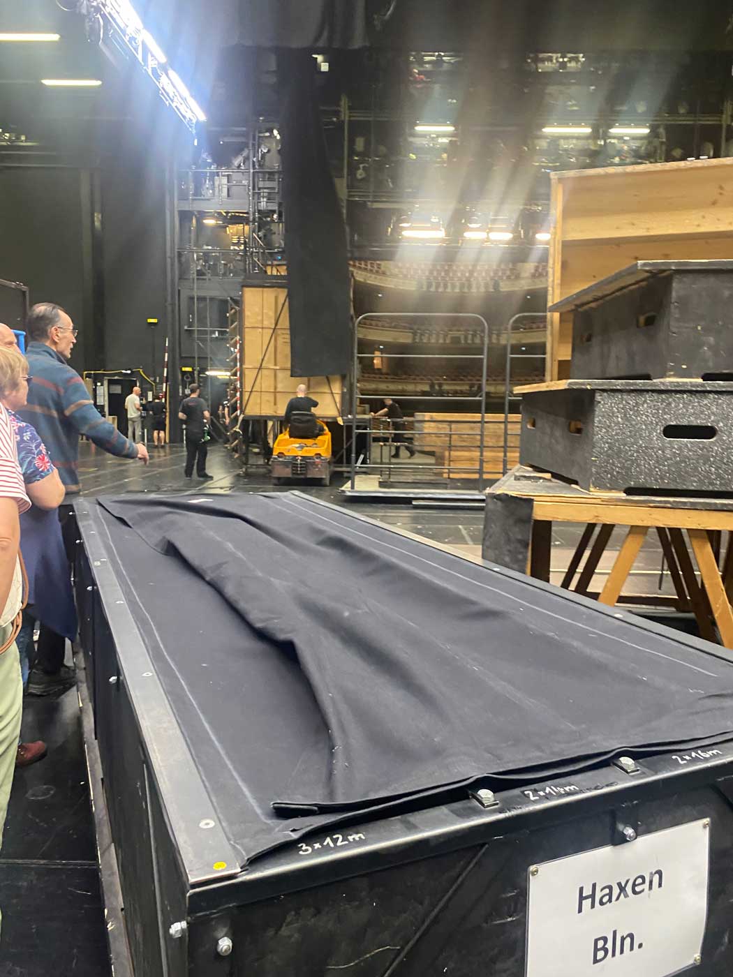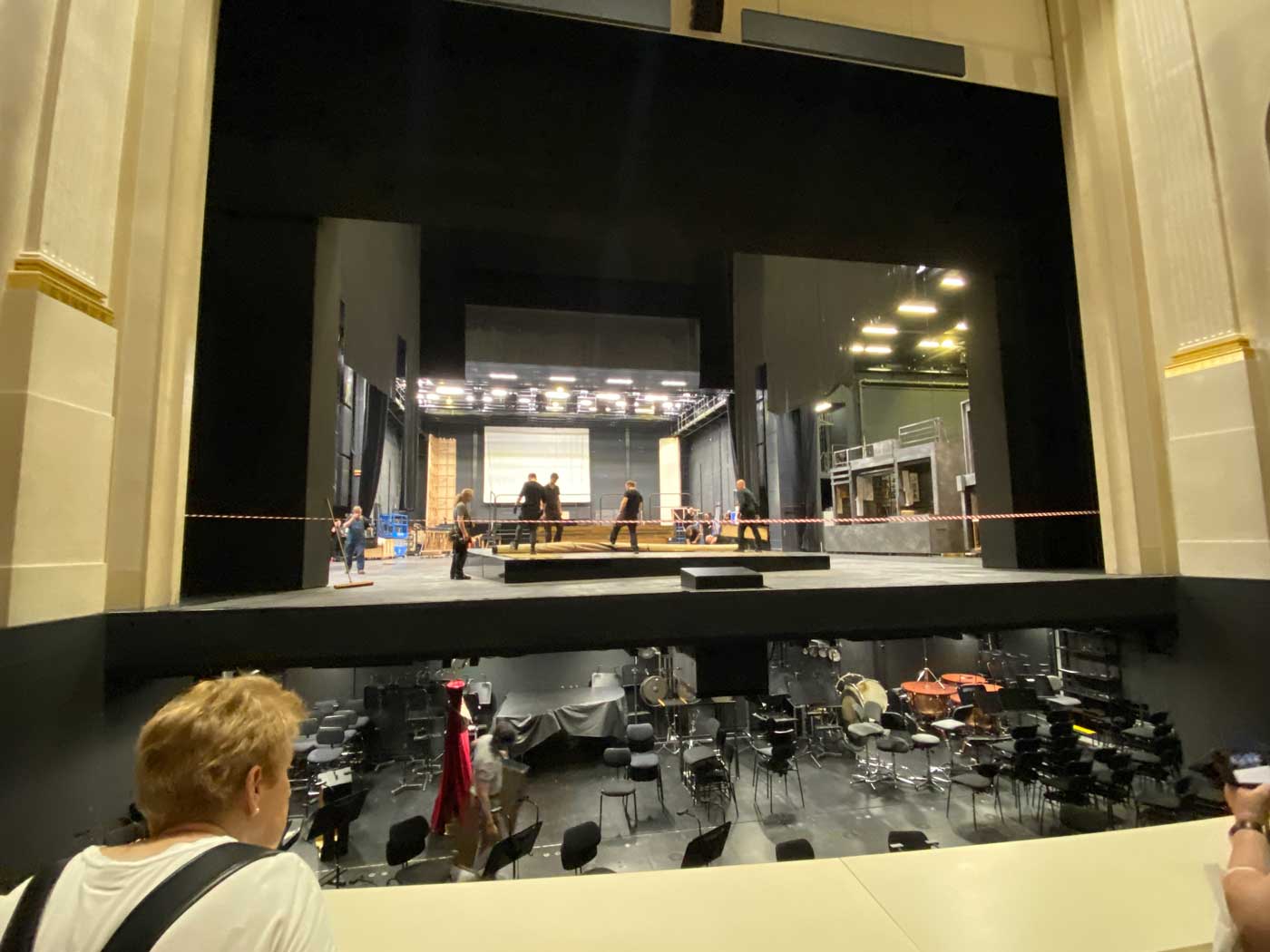 Na het bezoek aan de theaterzaal en de loge was het tijd op langzaamaan af te dalen naar het ondergrondse deel van het gebouw. Tijdens de rondleiding was iedereen op het podium druk bezig om alles in orde te brengen voor een voorstelling in de avond. De rondleider gaf aan hier ook nog een kleine rol in te hebben. De verlaagde ruimte voor het toneelpodium is de ruimte voor het orkest. Deze kan omhoog en omlaag gezet werden. Hij stond nu in een lage stand zodat alle stoelen en andere zaken precies op de juiste plaats weggezet konden worden voor de muzikanten.