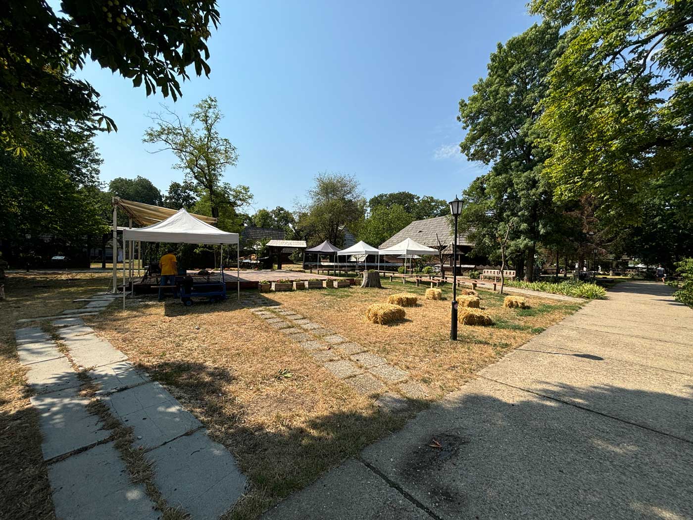 Op een grasveldje in het museum waren allerlei overkappingen weggezet. Ongetwijfeld voor een evenement dat later op de dag plaats zou gaan vinden. Hier is goed te zien hoe kurkdroog het al lange tijd in Roemenië is geweest. Het gras is helemaal verbrand door de zon en geel geworden.