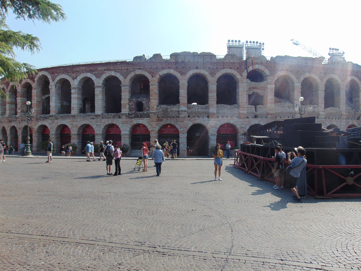 Uiteindelijk kom je dan uit bij de Arena van Verona. (http://www.arena.it/) Dit is een amfitheater dat voltooid is in het jaar 30 en dus al bijna 2000 jaar bestaat. Deze arena is te bezoeken. Je kunt door een deel van de gewelven lopen waar wat informatie gegeven wordt over de geschiedenis van dit gebouw.