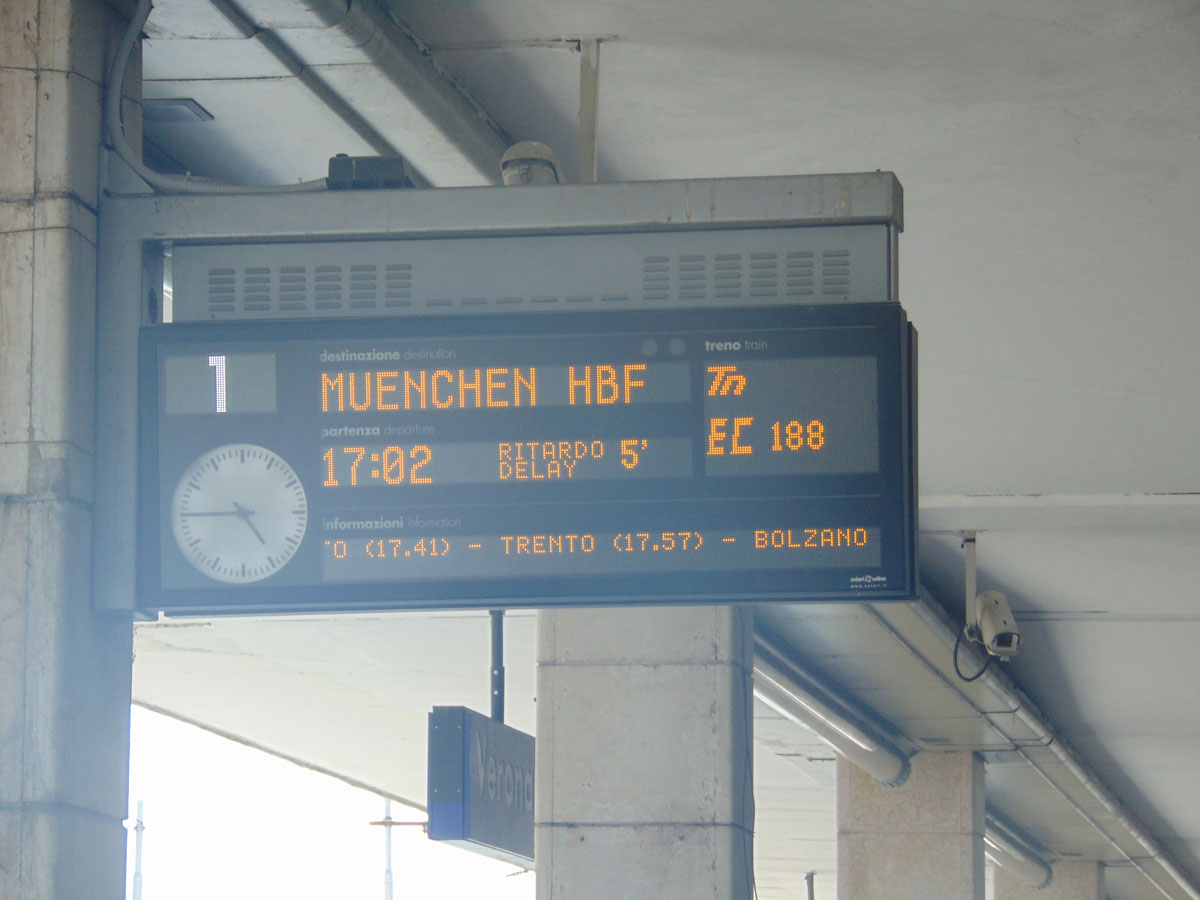 Aangekomen in Brenner stond de regionale trein naar Verona op het tegenoverliggende spoor al te wachten. Het kopen van treinkaartjes voor Italiaanse treinen kan tegenwoordig gewoon via internet. Vanuit Brenner duurt de rit naar Verona ongeveer drie uur. Het eerste deel van deze rit gaat door de provincie Zuid-Tirol. Dit is een deel van Italië waar overwegend Duits gesproken wordt. Aan de stations is dit ook te zien omdat alle opschriften in het Italiaans en Duits zijn.