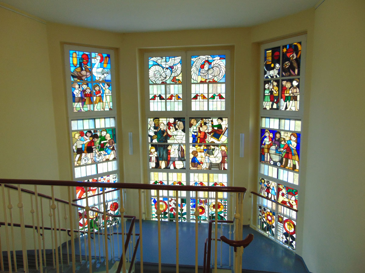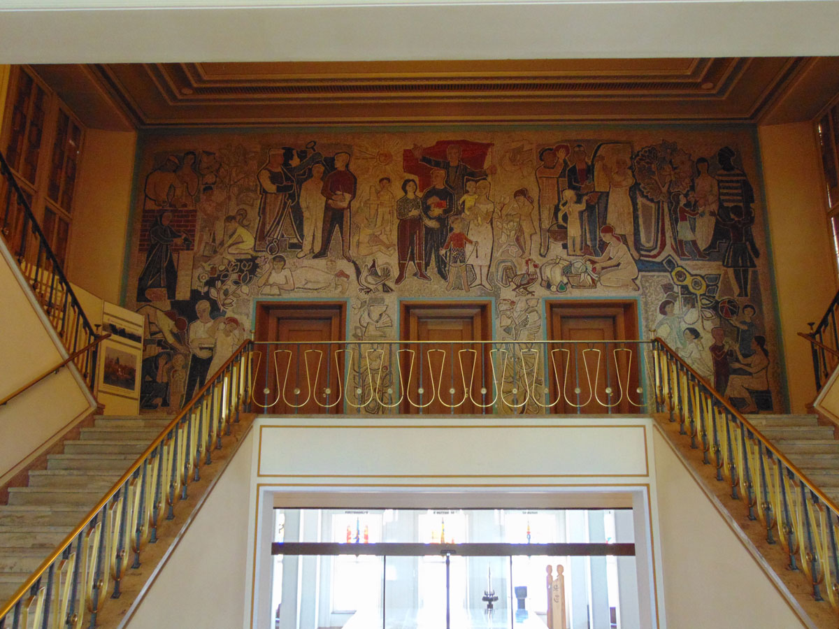 In de grote hal van het gemeentehuis zijn de originele beschilderingen uit de socialistische tijd bewaard gebleven.