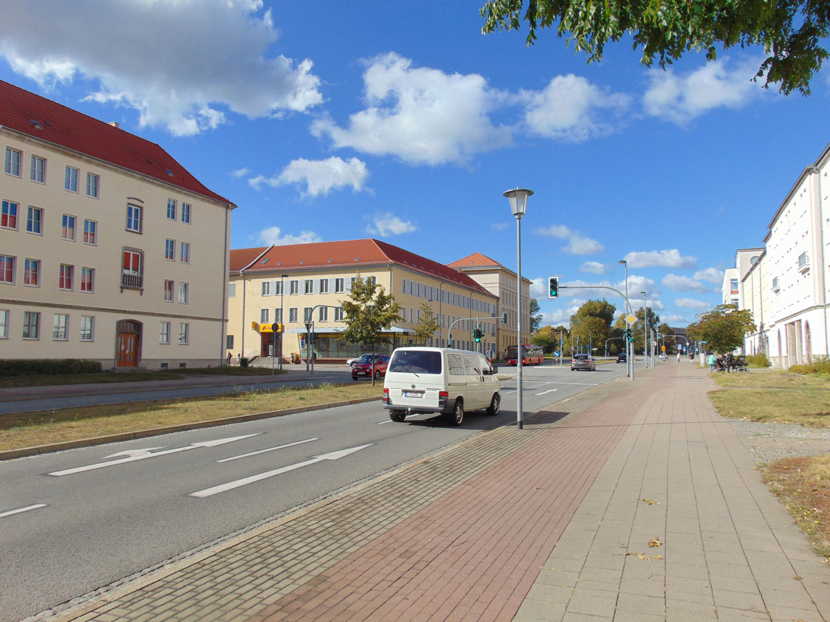 Langs de Friedrich-Engels-Strasse bevindt zich bijvoorbeeld het stedelijke ziekenhuis. Naarmate je langer door de stad loopt, valt het eenzijdige karakter van de bebouwing steeds meer op.
