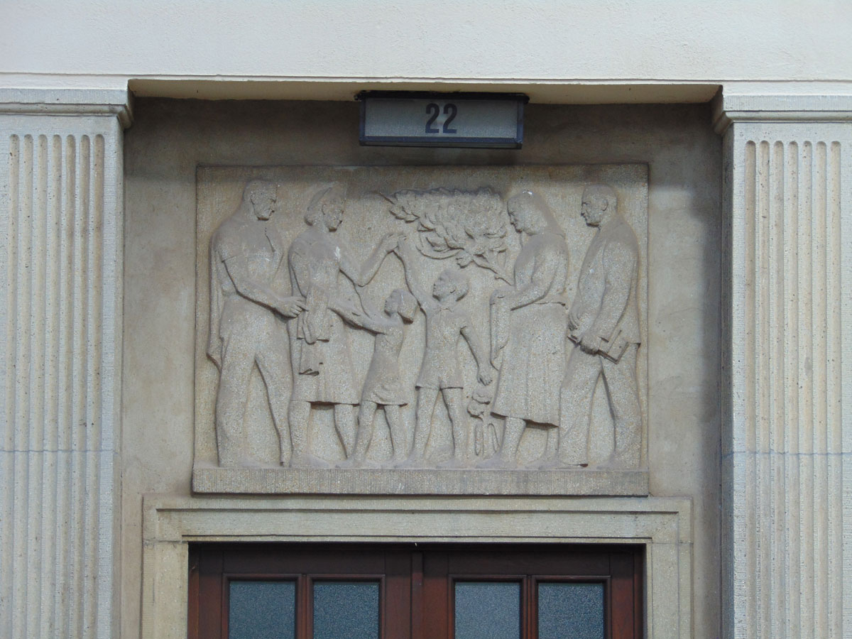 Andere overblijfselen uit de tijd van de DDR zijn de kunstwerken die op verschillende gebouwen te zien zijn. Zo is hier een kunstwerk te zien van een hand, die een duif loslaat. In de rechterbovenhoek zijn onder andere de vlaggen van de voormalige DDR en Sovjet-Unie te zien.