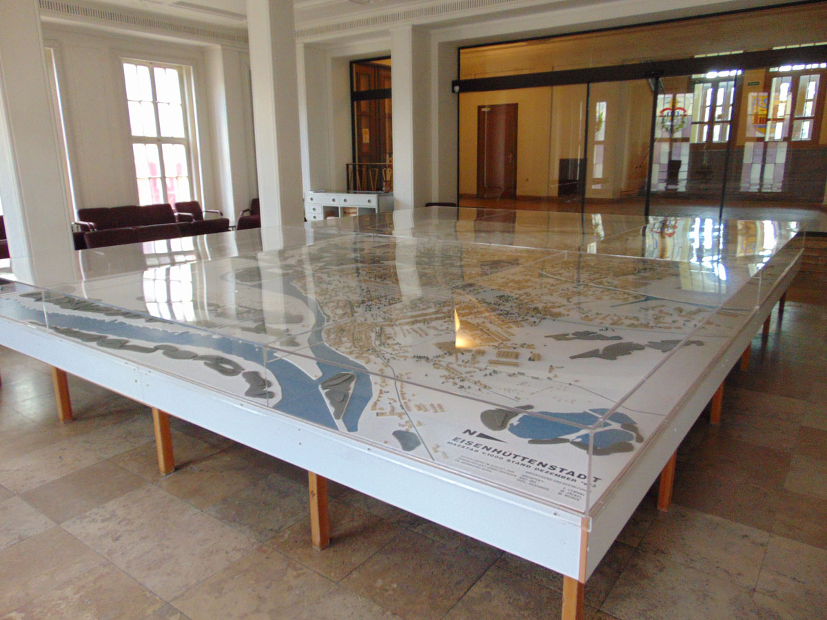 In het gemeentehuis bevindt zich een uitgebreide maquette van de stad. De glas-in-lood ramen verbeelden de wapens van de steden waarmee Eisenhüttenstadt een stedenband heeft.