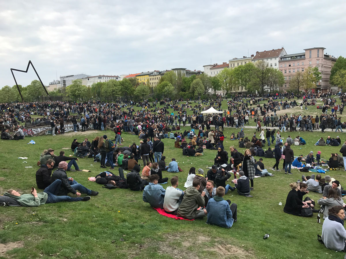 Op deze 1e mei was het Görlitzer Park, dat ook in Kreuzberg ligt, afgeladen vol. Veel mensen in Berlijn wonen in appartementen en hebben dus geen eigen tuin. Op vrije dagen worden de Berlijnse parken dan ook altijd druk bezocht.