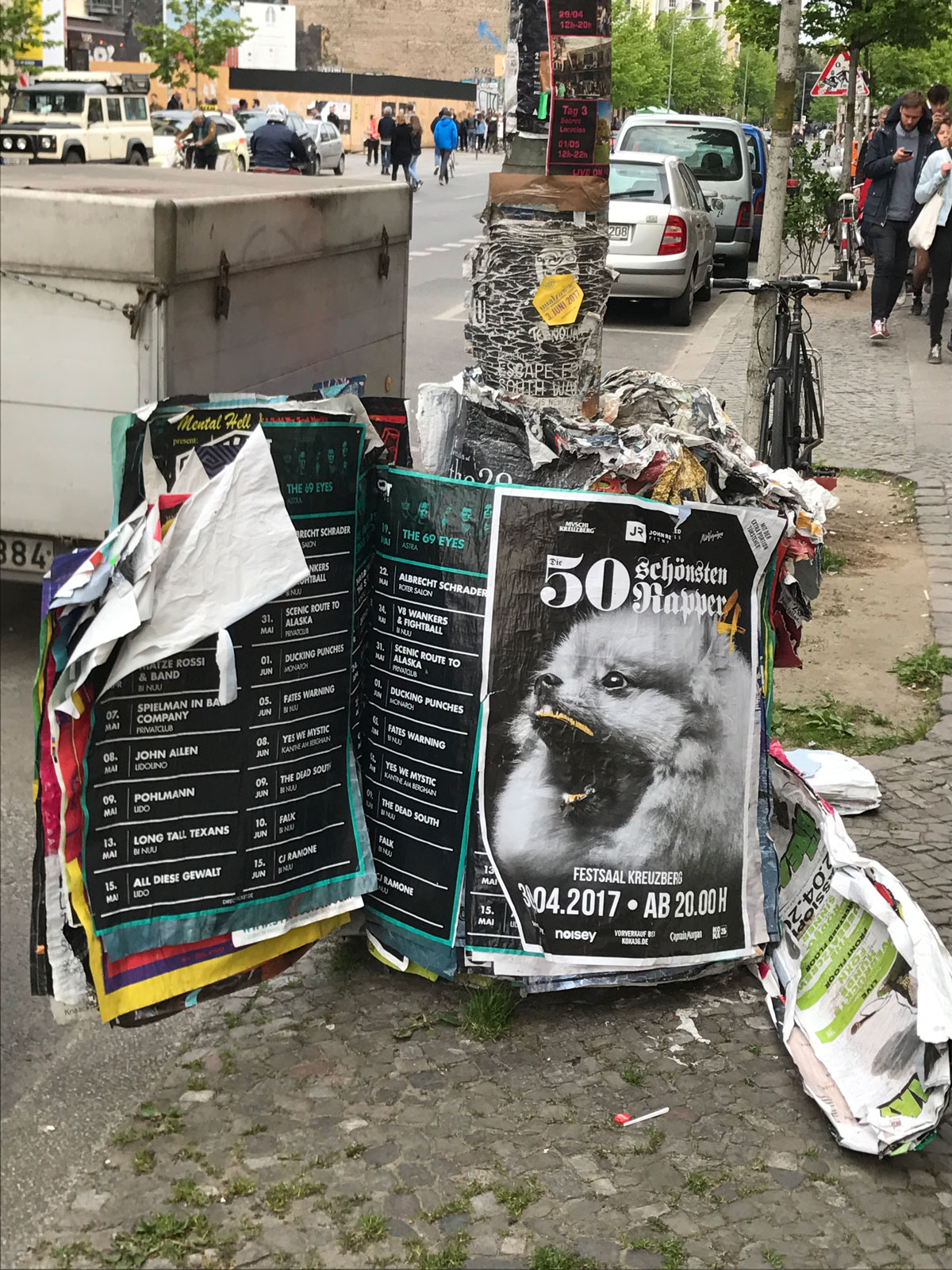 Waar er in Nederland wel eens geklaagd wordt over het wildplakken van posters, kunnen ze er in Berlijn ook wat van. Op de onderstaande foto is te zien, dat de posters gewoon over elkaar geplakt worden. Omdat er geen posters worden weggehaald is de lantarenpaal inmiddels meer dan twee keer zo groot geworden van omvang. Honderden posters zitten over elkaar heen geplakt en het plakken gaat gewoon door.