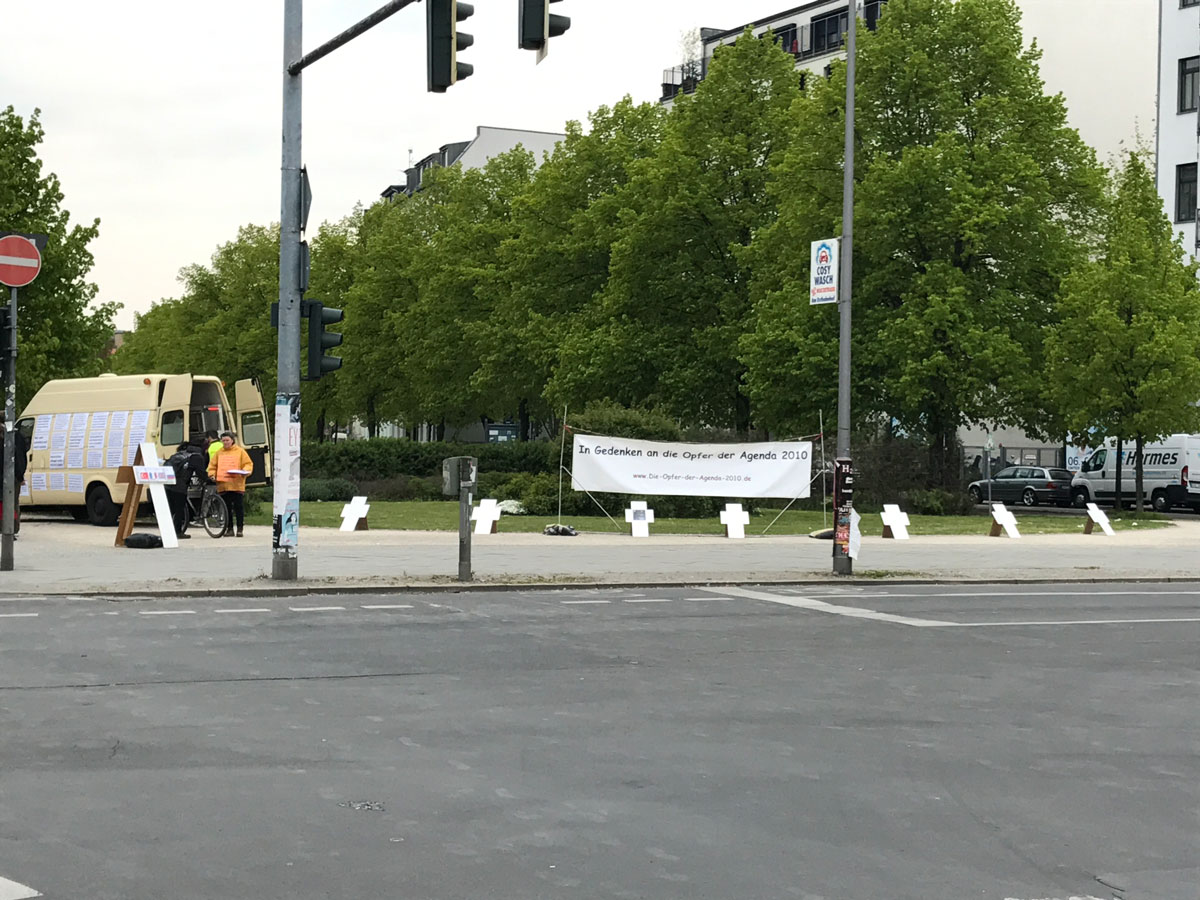 Nadat de hele demonstratie door Kreuzberg heen getrokken was, ben ik teruggelopen naar het Ostbahnhof. Op de weg hier naar toe kwam ik nog een clubje demonstranten tegen, die demonstreerden tegen de "Agenda 2010". Dit is beleid van de regering Schröder geweest om de Duitse arbeidsmarkt te hervormen. Ondanks dat dit is doorgevoerd door een coalitieregering van Sociaal-Democraten en Groenen is er in bepaalde linkse kringen nog steeds verzet tegen deze maatregelen omdat ze daar als neoliberaal beschouwd worden.