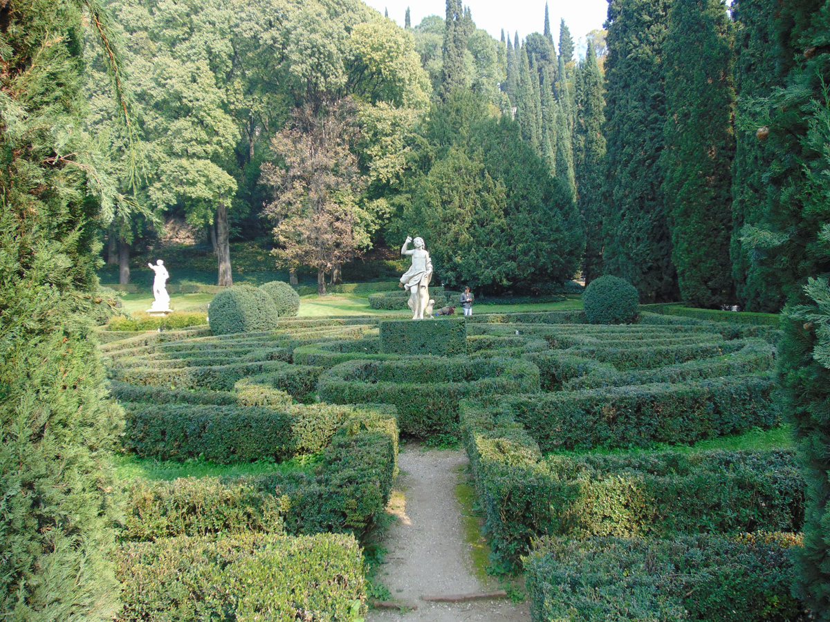 Het grootste deel van de tuin bestaat uit een negental rechthoekige gebieden. Hier is een van deze gebieden te zien. In zeven van de negen gebieden staat een fontein in het midden. Ook is er nog een labyrint dat ontworpen is door Luigi Trezza in 1786 en nog steeds toegankelijk is.