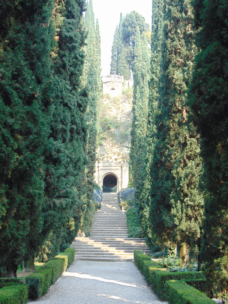 Als je vanuit de straat naar binnenkomt, kom je uit op een binnenplaats vanwaar je de tuin kunt zien. Als eerste zie je dan een rij hoge bomen. Een van deze bomen cipres van meer dan 600 jaar. Deze boom is bekend als de Goethe cipres en is beschreven in zijn reis door Italië uit 1817.