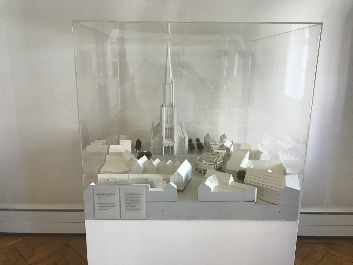 De onderstaande maquette uit 1986 van Richard Meier is gemaakt als voorbeeld hoe de Münsterplatz opnieuw ingericht zou kunnen worden. Als je nu op de Münsterplatz staat dan zie je daar naast de monumentale kerk ook moderne gebouwen staan. Zoals eerder aangegeven is Ulm in de oorlog zwaar verwoest en na de oorlog opnieuw opgebouwd.