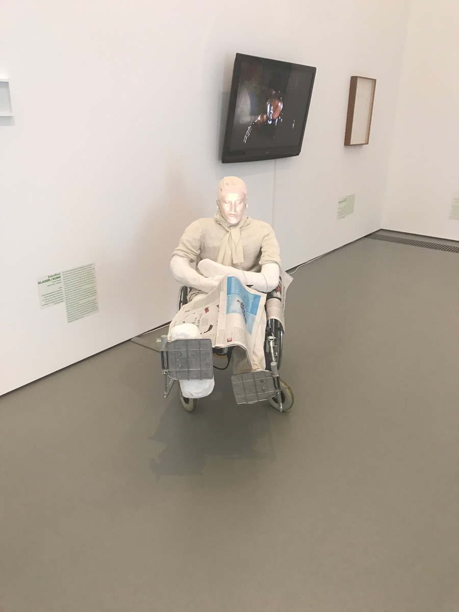 Op de onderstaande foto is een kunst Glaser/Kunz uit 2009 te zien. Het is een beeld van een persoon die in een rolstoel ziet en steeds bepaalde dingen zegt. Hierdoor lijkt de figuur als het ware te leven.