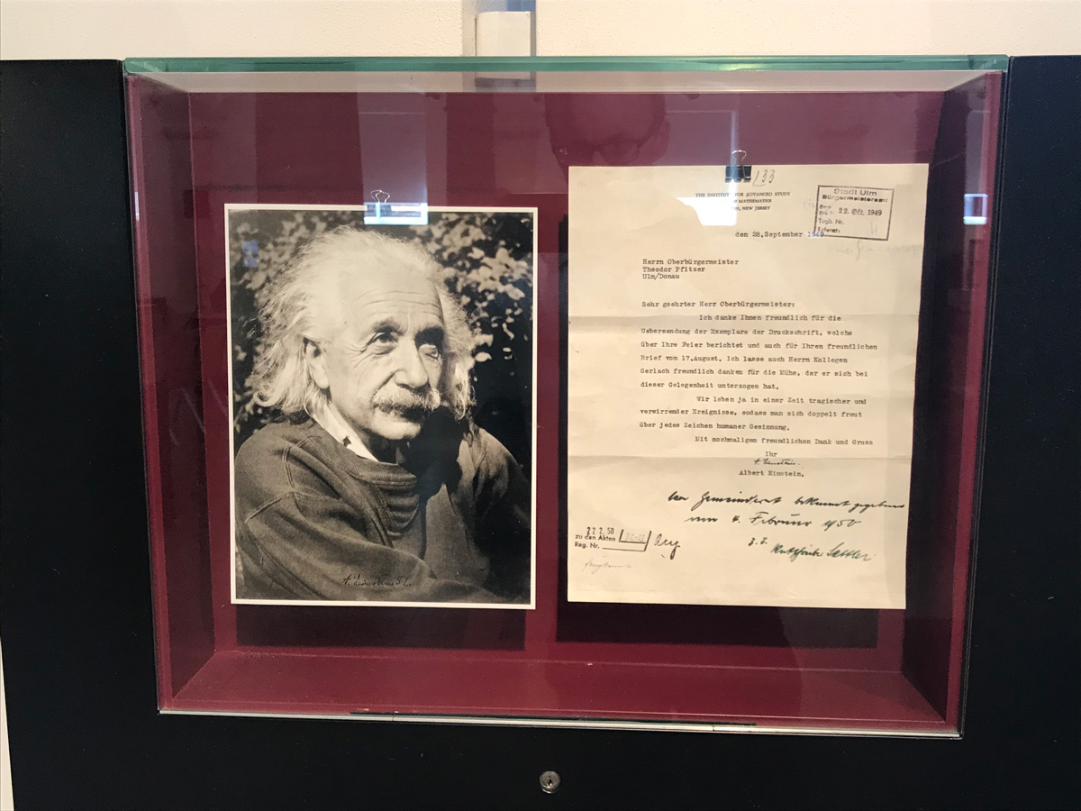 Albert Einstein wordt op 14 maart 1879 in Ulm geboren. Al een jaar later vertrekt de familie naar München. Hieronder is een brief te zien die Einstein in 1949 gestuurd heeft aan de toenmalige burgemeester van de stad. Ter gelegenheid van zijn zeventigste verjaardag is er in 1949 een symposium.