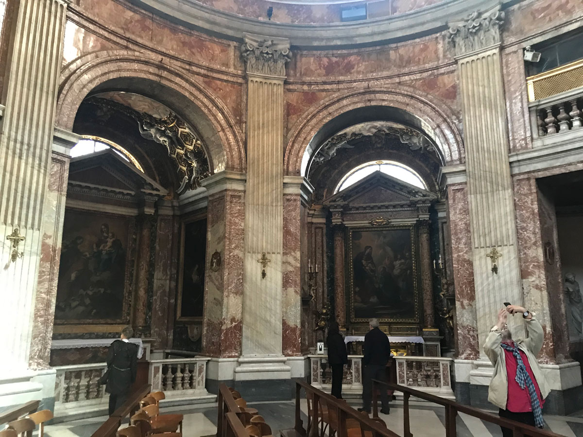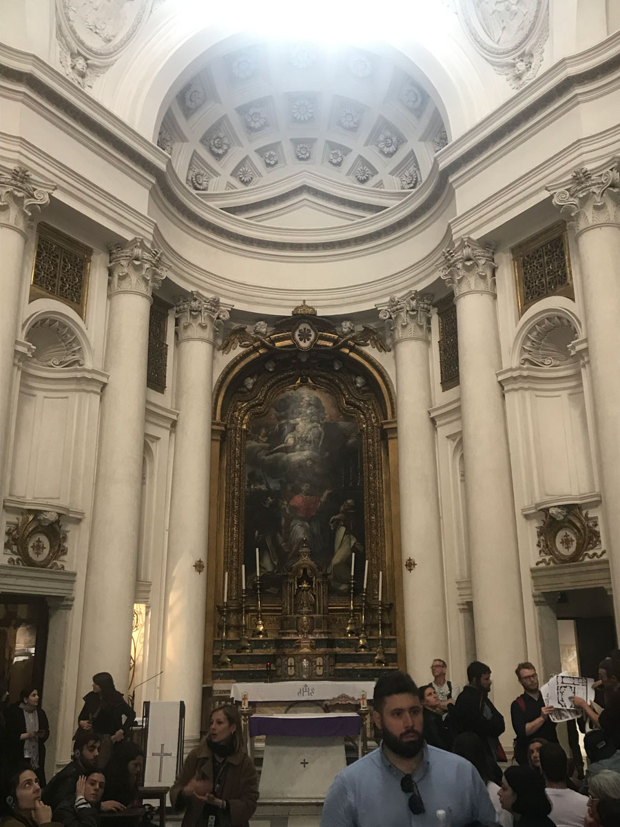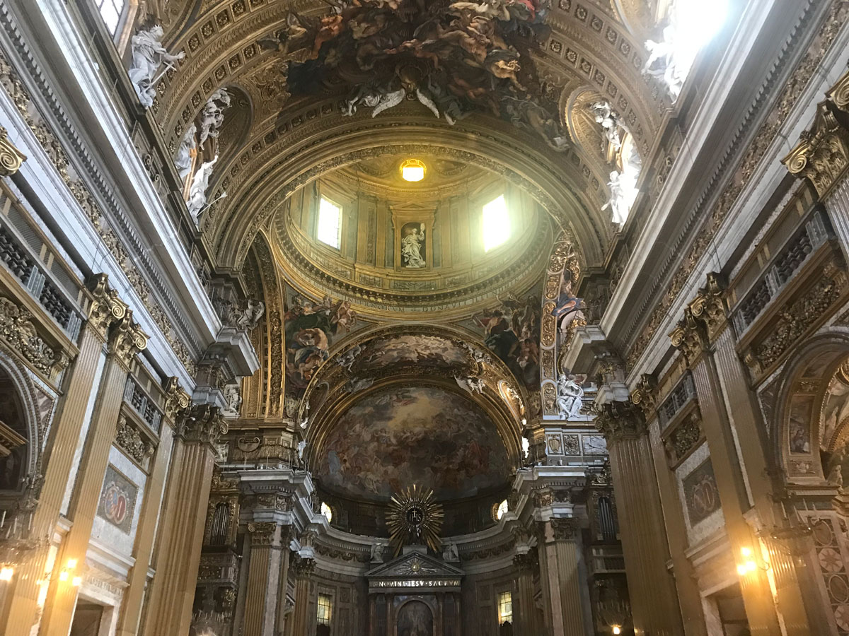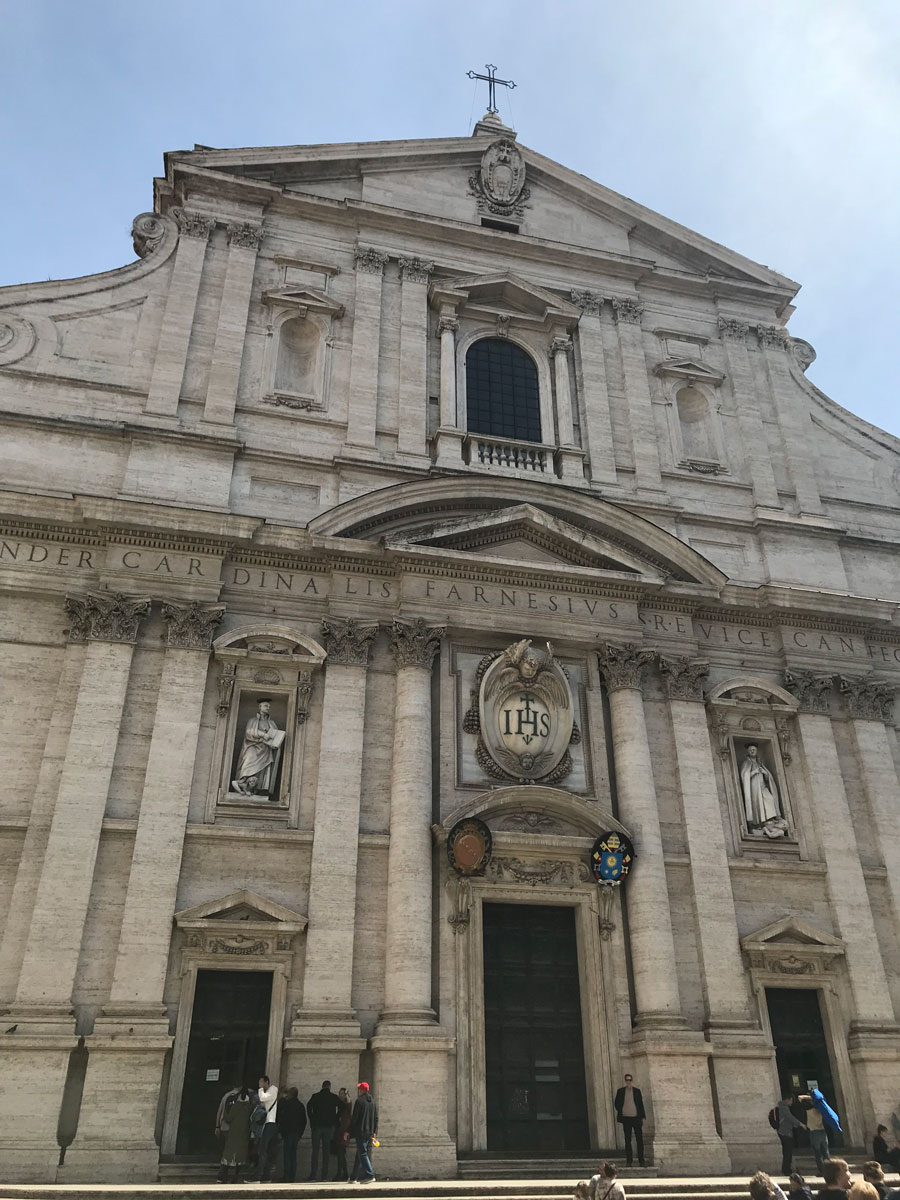 De laatste kerk die tijdens het ochtenddeel van de wandeling bezocht is, is de Chiesa del Gesu kerk. Deze kerk is eind 16de eeuw gebouwd in opdracht van kardinaal Alessandroo Farnese. De kerk is sinds ze in 1584 is ingewijd de belangrijkste kerk van de Jezuïeten in Rome.