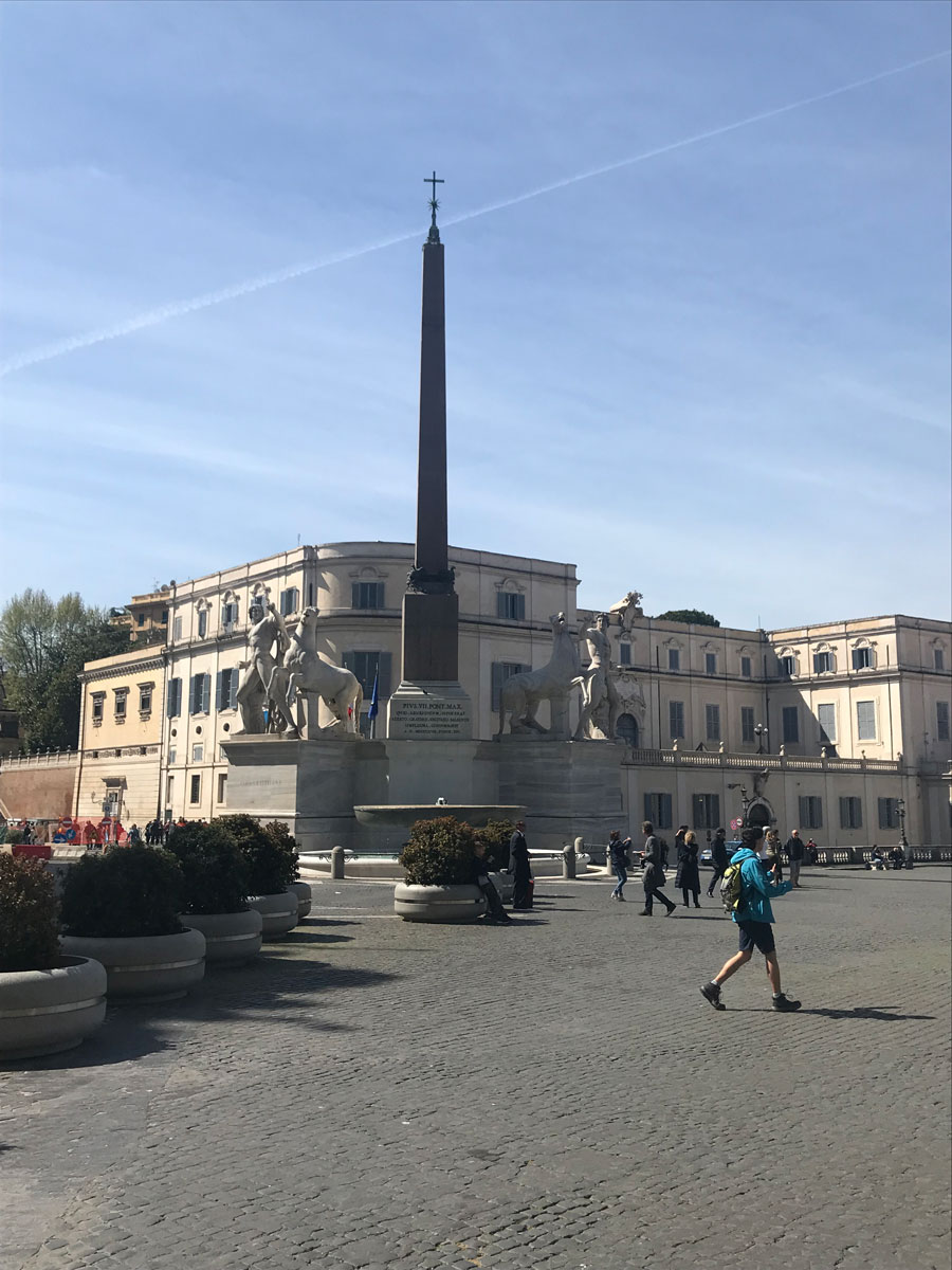 Op het Piazza del Quirinale staat een obelisk met bijbehorende fontein. Naast de obelisk staan twee 5,5 meter hoge beelden van Castor en Pollux die hun paarden in bedwang houden. Deze beelden stonden vroeger aan de ingang van de Thermen van Constantijn. De obelisk zelf, die veertien meter hoog is, stond vroeger aan de ingang van het mausoleum van Augustus.