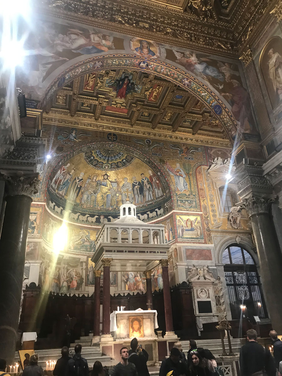 De onderstaande foto laat een apsismozaïek uit de 12de eeuw zien. In het centrum staan Christus en Maria. Links van hun een aantal pausen. In het mozaïek zijn de Byzantijnse invloeden duidelijk zichtbaar. Onder het mozaïek is het altaar met ciborium te zien. Dit is een overkapping van het altaar die rust op vier zuilen.