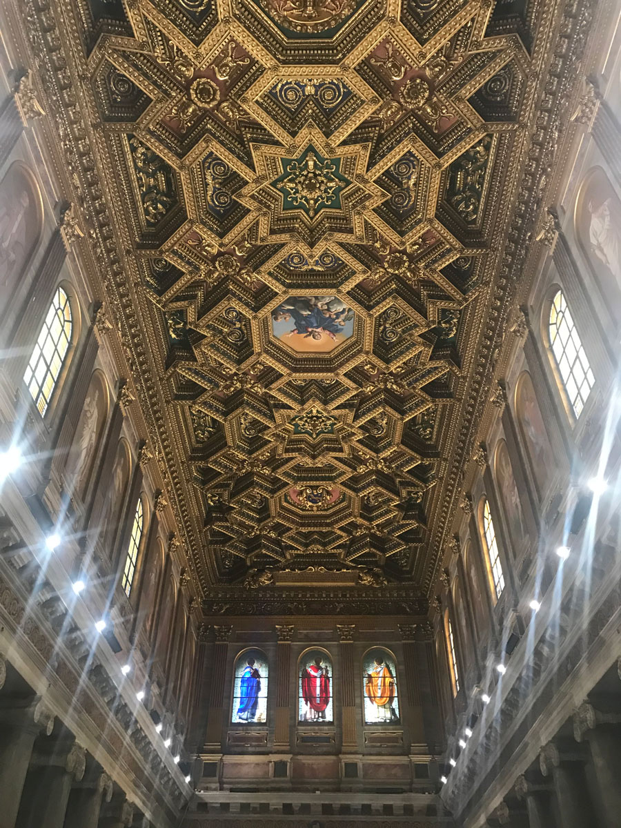 Op de volgende foto is nogmaals het apsismozaïek te zien, maar nu meer van dichtbij. Halverwege worden Jezus en zijn 12 apostelen als lammeren uitgebeeld. Na het bezoek aan deze kerk werd de rest van de avond doorgebracht in de wijk Trastevere. De wijk is vooral ’s avond een gezellige uitgaangswijk met veel studenten en allerlei cafës en restaurants waar je goed kunt eten en uitgaan. Overal op straat bevonden zich ook handelaren die hun spulletjes aan de man probeerden te brengen. Na in een van de vele restaurantjes wat gegeten te hebben, kwamen we uiteindelijk terecht een gezellige bar in de wijk met live muziek (Pimm’s Good – Via di Santa Dorotea 8). De tip hiervoor kregen we weer van een ober van een restaurant. Na even gezocht te hebben konden we deze bar uiteindelijk vinden. Doordat het hier erg gezellig was, misten we met een aantal collega’s de laatste metro terug naar het hotel. Een van de collega’s wist nog een Ubertaxi te regelen waardoor we uiteindelijk netjes terug konden naar ons hotel.
