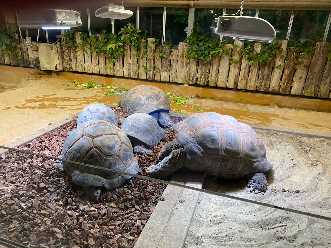De schildpadden hadden geen last van de kou, want die lagen er warm bij in hun verblijf dat voorzien was van warmtelampen.